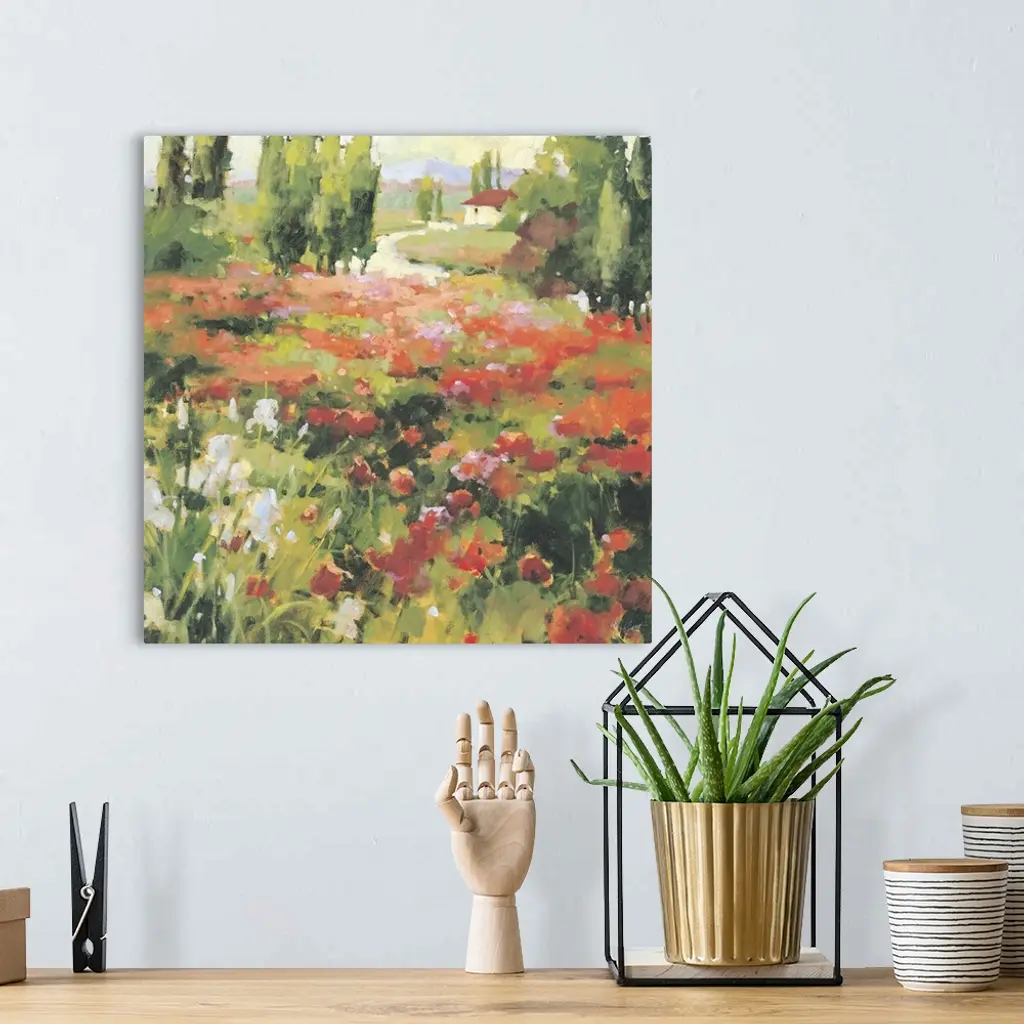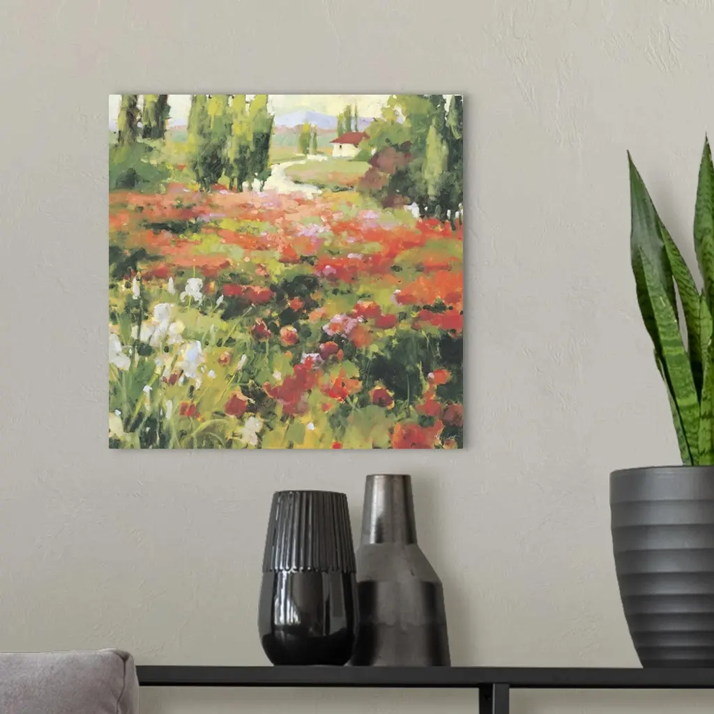 Contemporary painting of a field of wildflowers in a valley, with a red roofed house in the distance.