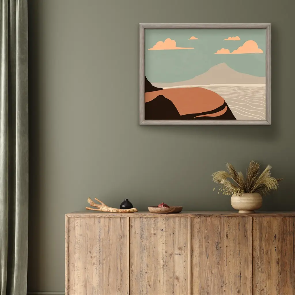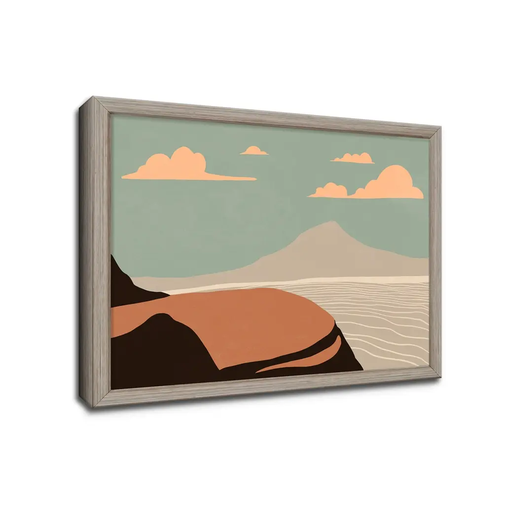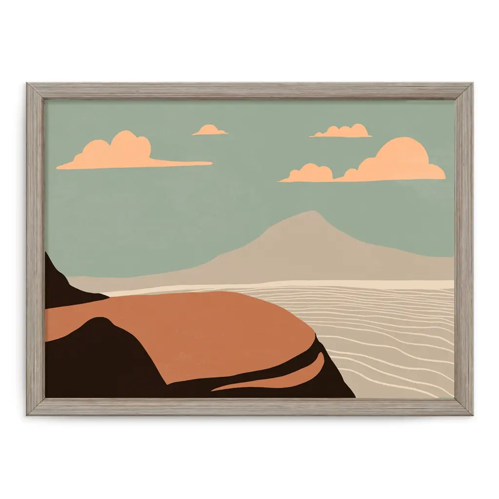 Rejuvenate your space with this trendy nomadic landscape framed print art titled 'Summer Nomad IV' by ChiChi Decor. The horizontal decorative artwork with shades of sage, brown and burnt orange features an earthy colored mountain cliff above a calm body of water that will complement any contemporary decor's aesthetic. Designed and handcrafted in Chattanooga, Tennessee by Ready2HangArt, this artwork is assembled using an archival eco-friendly print on board and a white weathered pine wood frame, then finished with a rear hanger for simple installation. Offering a wide range of collections, ChiChi Decor will add on trend styles to any modern or contemporary space.Product Features: Expertly printed using archival ink on board Skillfully hand assembled with a white weathered pine wood frame Hanging hardware included for easy installation Made in the USA