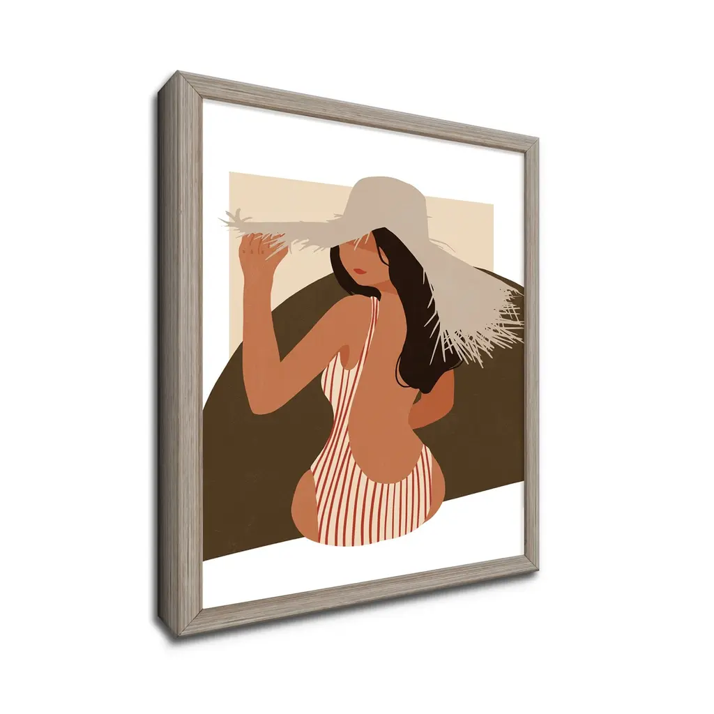 Rejuvenate your space with this trendy nomadic framed print art titled 'Summer Nomad XVII' by ChiChi Decor. The vertical decorative artwork with shades of ivory, brown and burnt orange features a dark skinned woman wearing a swimsuit and shade hat that will complement any contemporary decor's aesthetic. Designed and handcrafted in Chattanooga, Tennessee by Ready2HangArt, this artwork is assembled using an archival eco-friendly print on board and a white weathered pine wood frame, then finished with a rear hanger for simple installation. Offering a wide range of collections, ChiChi Decor will add on trend styles to any modern or contemporary space.Product Features: Expertly printed using archival ink on board Skillfully hand assembled with a white weathered pine wood frame Hanging hardware included for easy installation Made in the USA