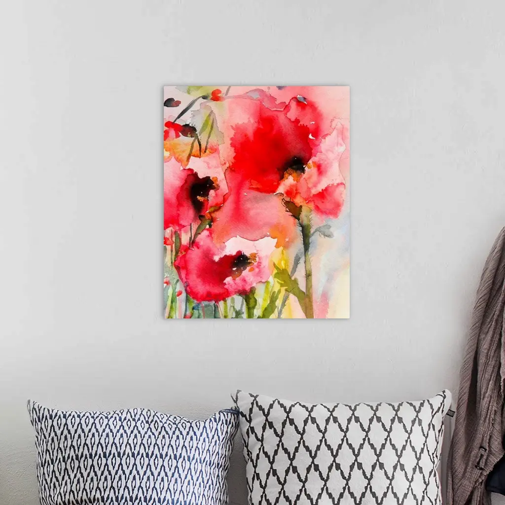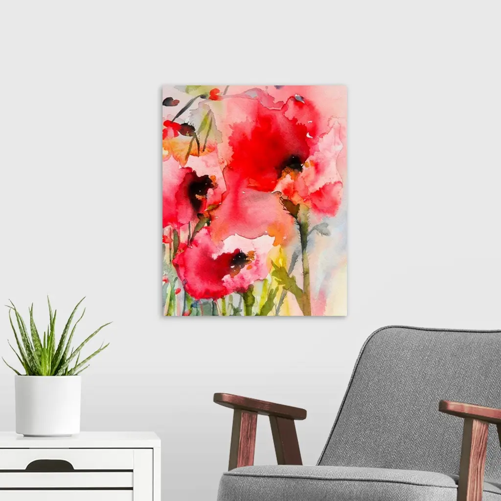 Contemporary watercolor painting of vibrant red flowers.