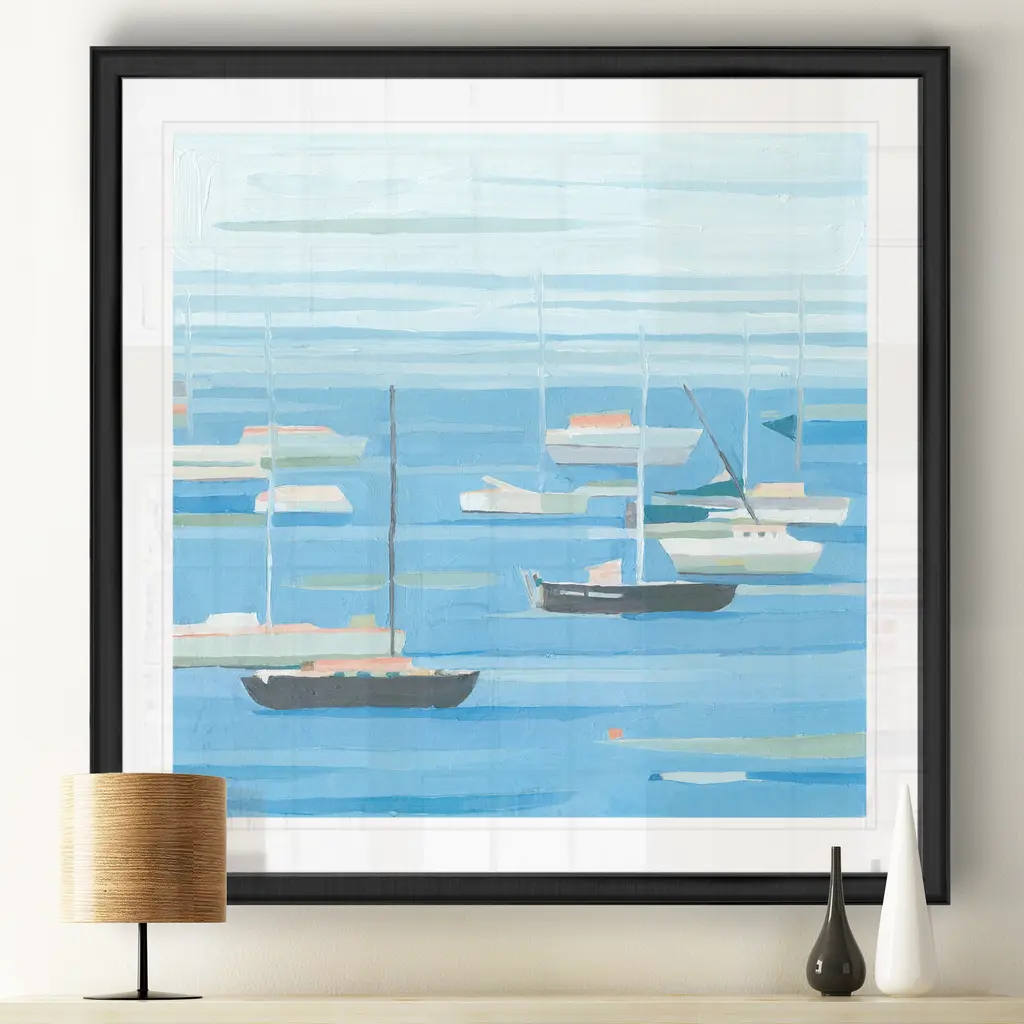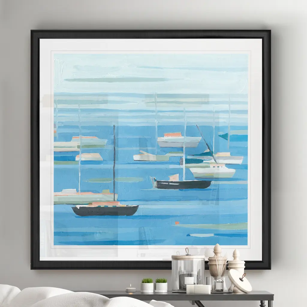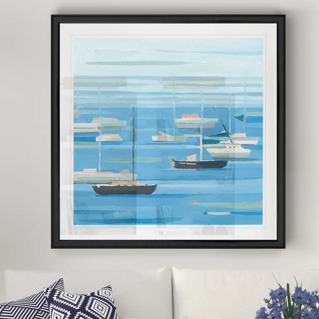Summer Regatta II -Black Framed Print A premium Black Framed giclee print Featuring a beveled a matt , acrylic glass, and a high quality giclee print 5 SIZES AVAILABLE 34''x34''- Overall Size 30''x30'' - Overall Size 26''x26''' - Overall Size 22''x22''' - Overall Size 18''x18''' - Overall Size Each piece is made to order. Built to Last Each piece comes ready to hang Fade and Water resistant Made domestically