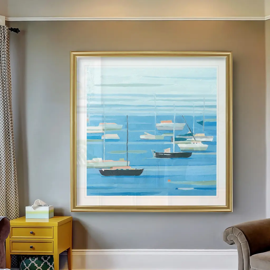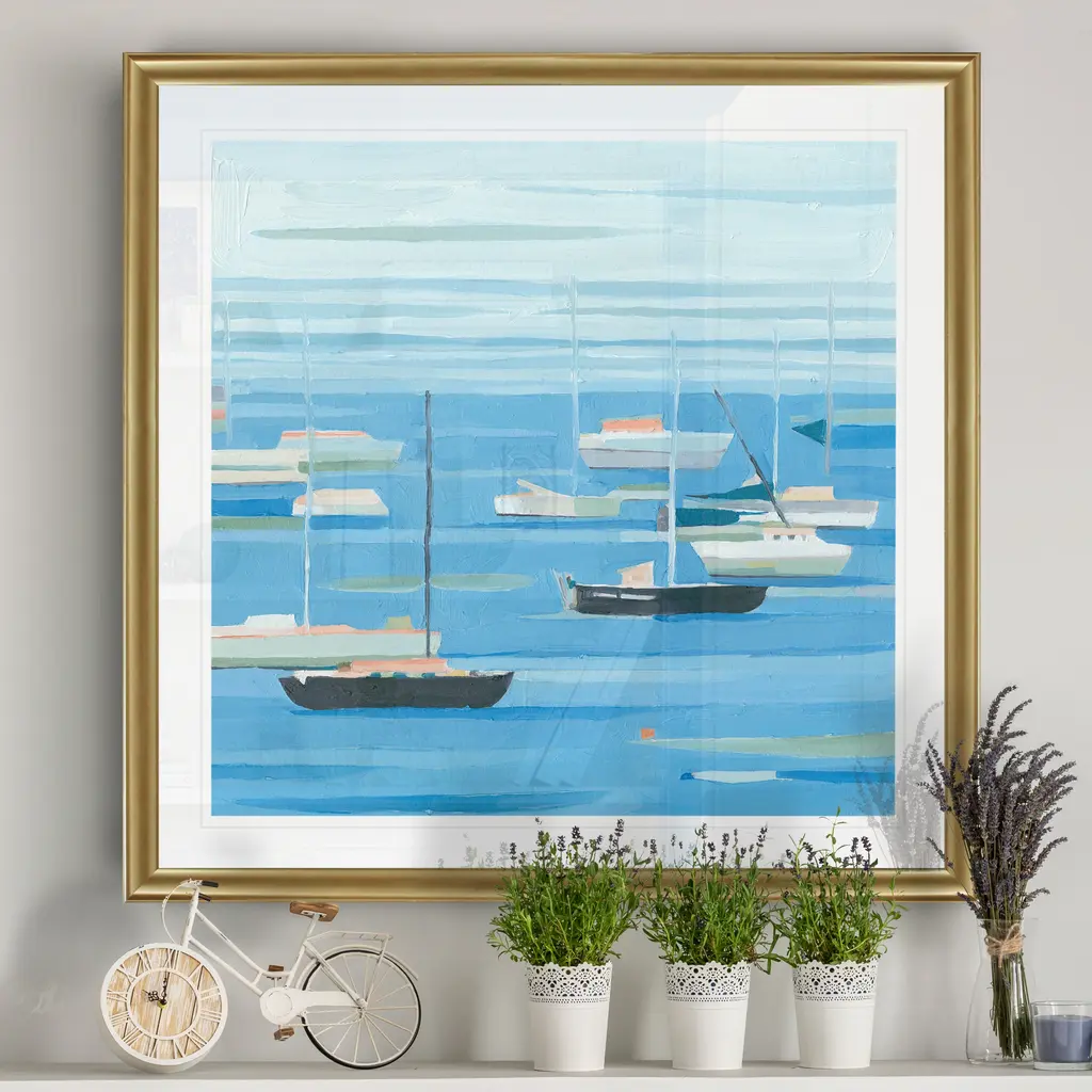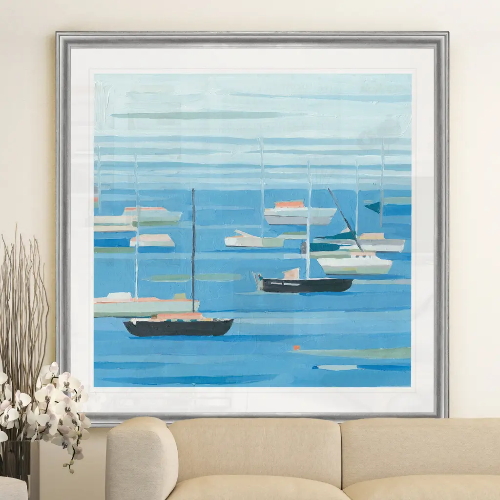 Summer Regatta II -Black Framed Print A premium Black Framed giclee print Featuring a beveled a matt , acrylic glass, and a high quality giclee print 5 SIZES AVAILABLE 34''x34''- Overall Size 30''x30'' - Overall Size 26''x26''' - Overall Size 22''x22''' - Overall Size 18''x18''' - Overall Size Each piece is made to order. Built to Last Each piece comes ready to hang Fade and Water resistant Made domestically