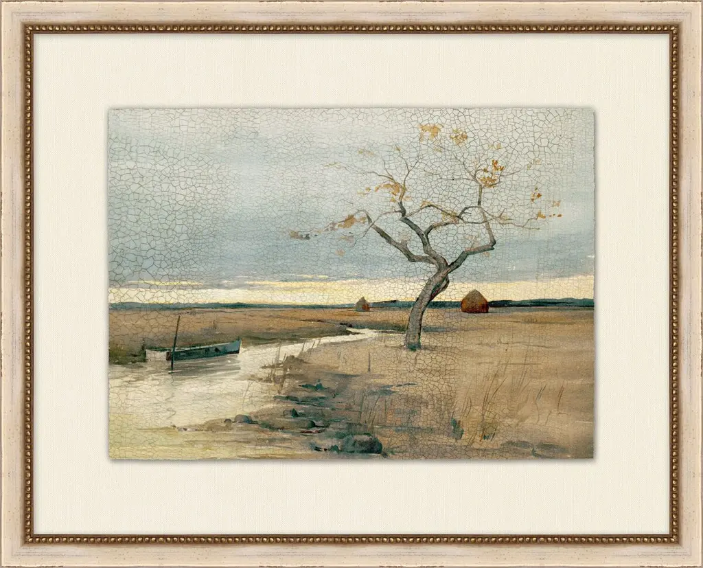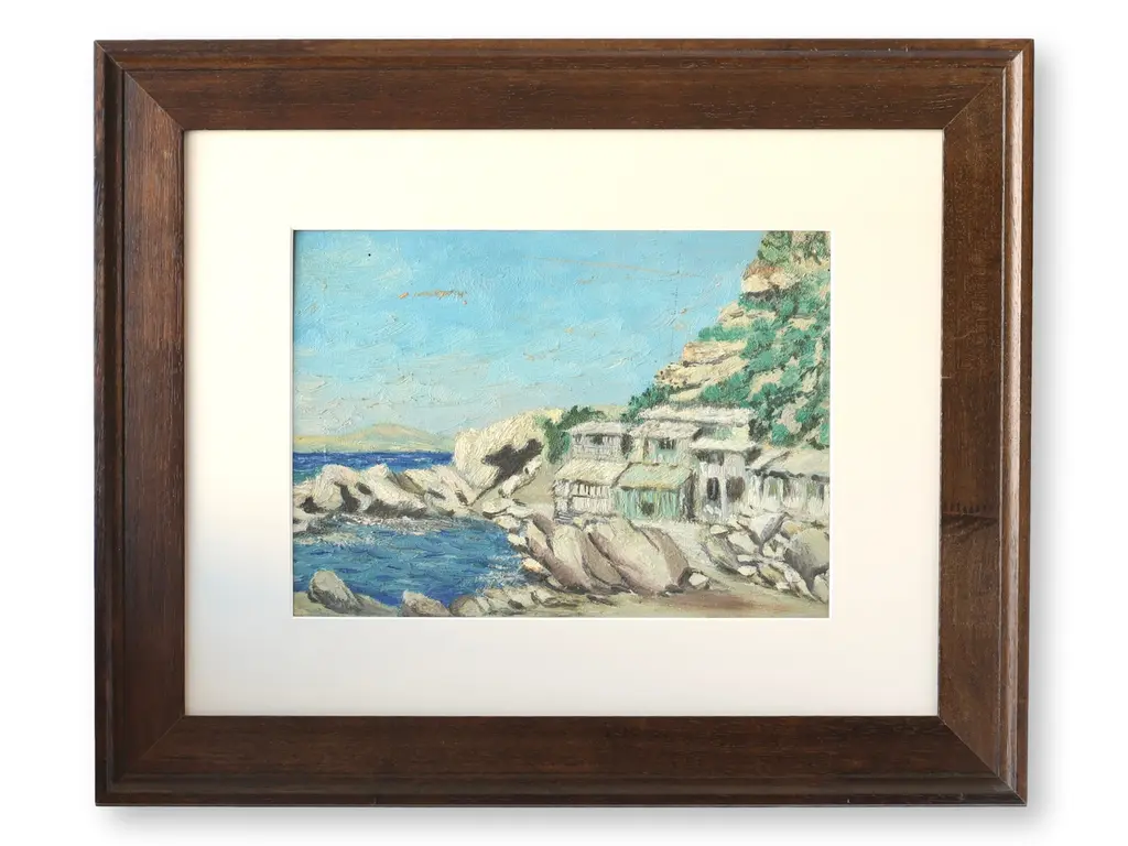 This breezy seascape captures a quiet Mediterranean shore, where colorful fishing boats rest on sun-warmed sand. Framed by lush greenery and gentle cliffs, the scene radiates relaxed charm and timeless coastal beauty. Printed on archival paper and elegantly matted and framed, it brings a light, tranquil spirit to any room.