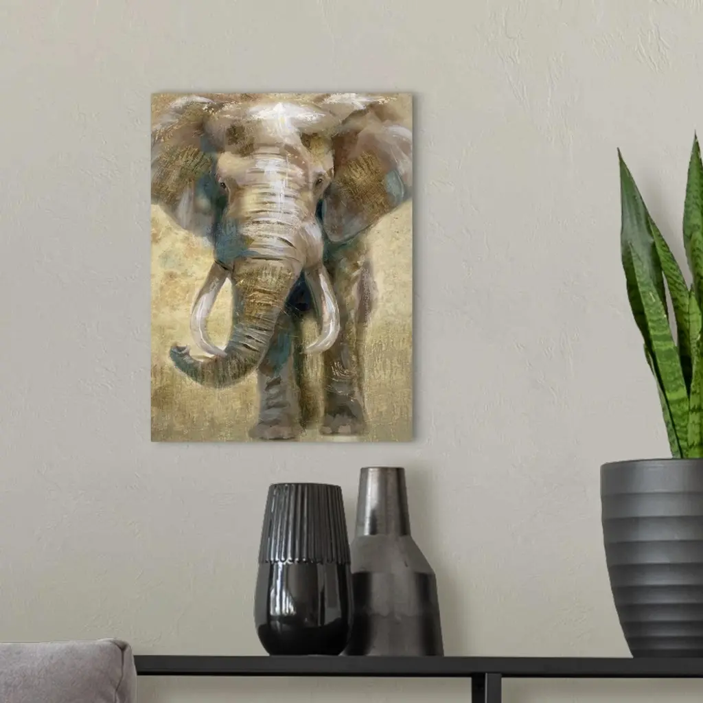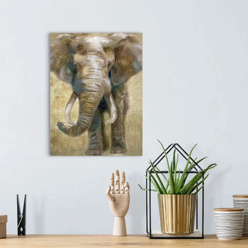 Contemporary painting of an elephant in gray, brown, white, and gold hues.