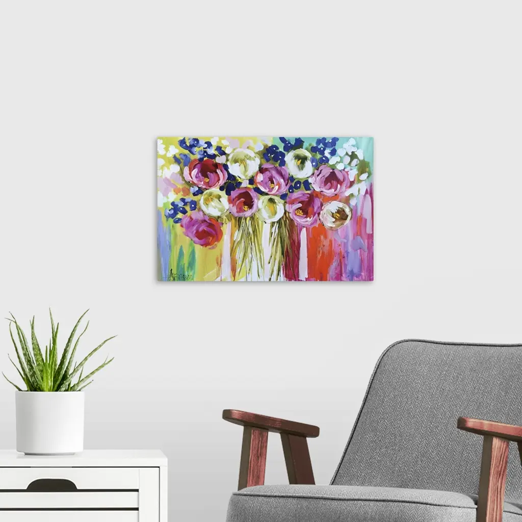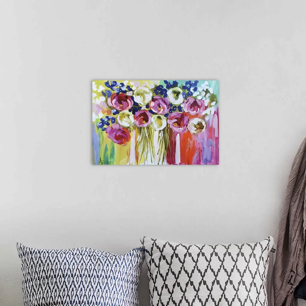A colorful contemporary painting of a group of flowers on a multi-colored background.