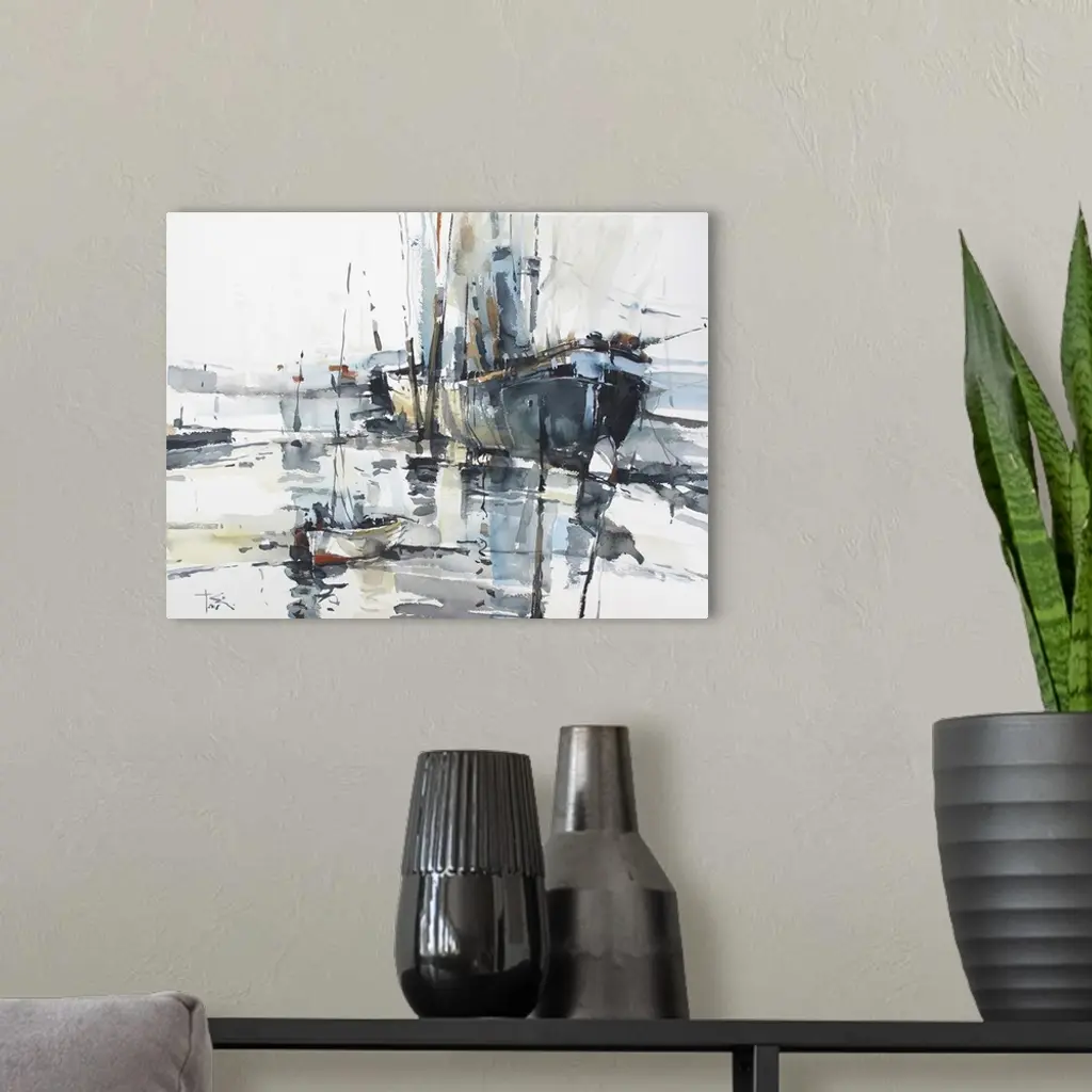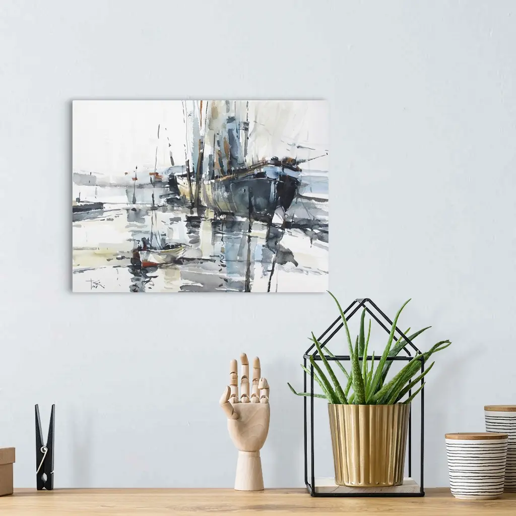 This contemporary artwork uses energetic watercolor brush strokes to illustrate the intensity of a massive ship in comparison to a small boat along the Croatian coast line.