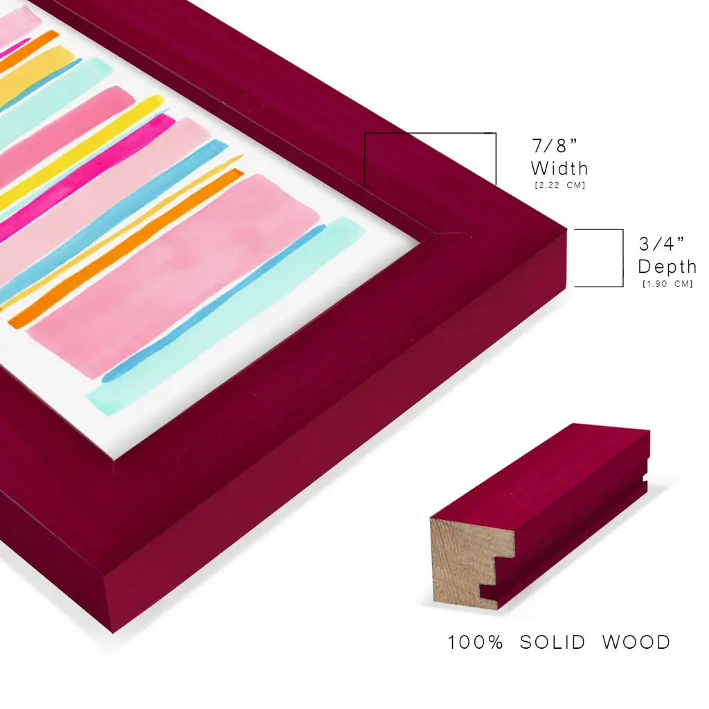 Summer Stripes I -EZ SWITCH Framed Print w/glass-Cherry Red A delightful, framed print. Featuring a solid wood frame with real wood glass. This premium print is giclee quality. In addition, every frame features a removable back and table top stand. This allows you to change your art in the future or to just stand the art on a table for a new look. We are sure you'll enjoy our new series of EZ SWITCH Framed Art. Solid Wood Frame Real Glass Removable / Replaceable Art Built in Tabletop Stand Sizes range from 4x6 up to 12x15 - buy just one or pair them up as sets as you see fit.