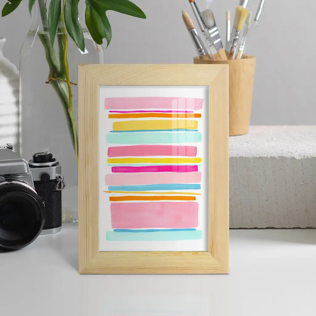 Summer Stripes I -EZ SWITCH Framed Print w/glass-Cherry Red A delightful, framed print. Featuring a solid wood frame with real wood glass. This premium print is giclee quality. In addition, every frame features a removable back and table top stand. This allows you to change your art in the future or to just stand the art on a table for a new look. We are sure you'll enjoy our new series of EZ SWITCH Framed Art. Solid Wood Frame Real Glass Removable / Replaceable Art Built in Tabletop Stand Sizes range from 4x6 up to 12x15 - buy just one or pair them up as sets as you see fit.