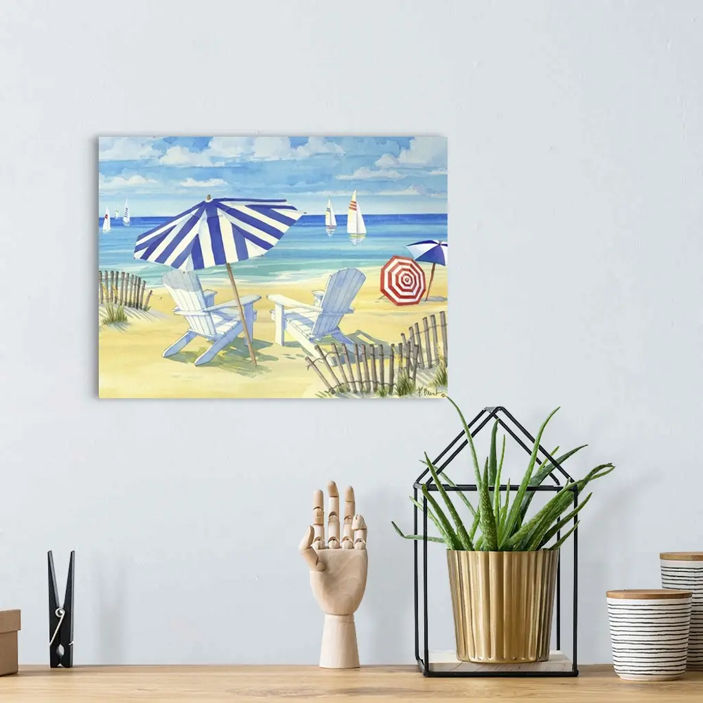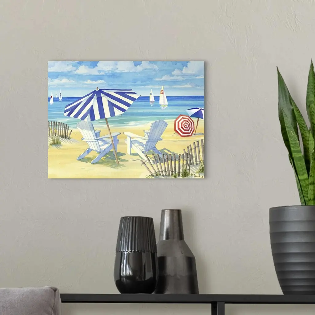 Watercolor painting of a peaceful ocean scene with striped umbrellas and beach chairs in the sand.