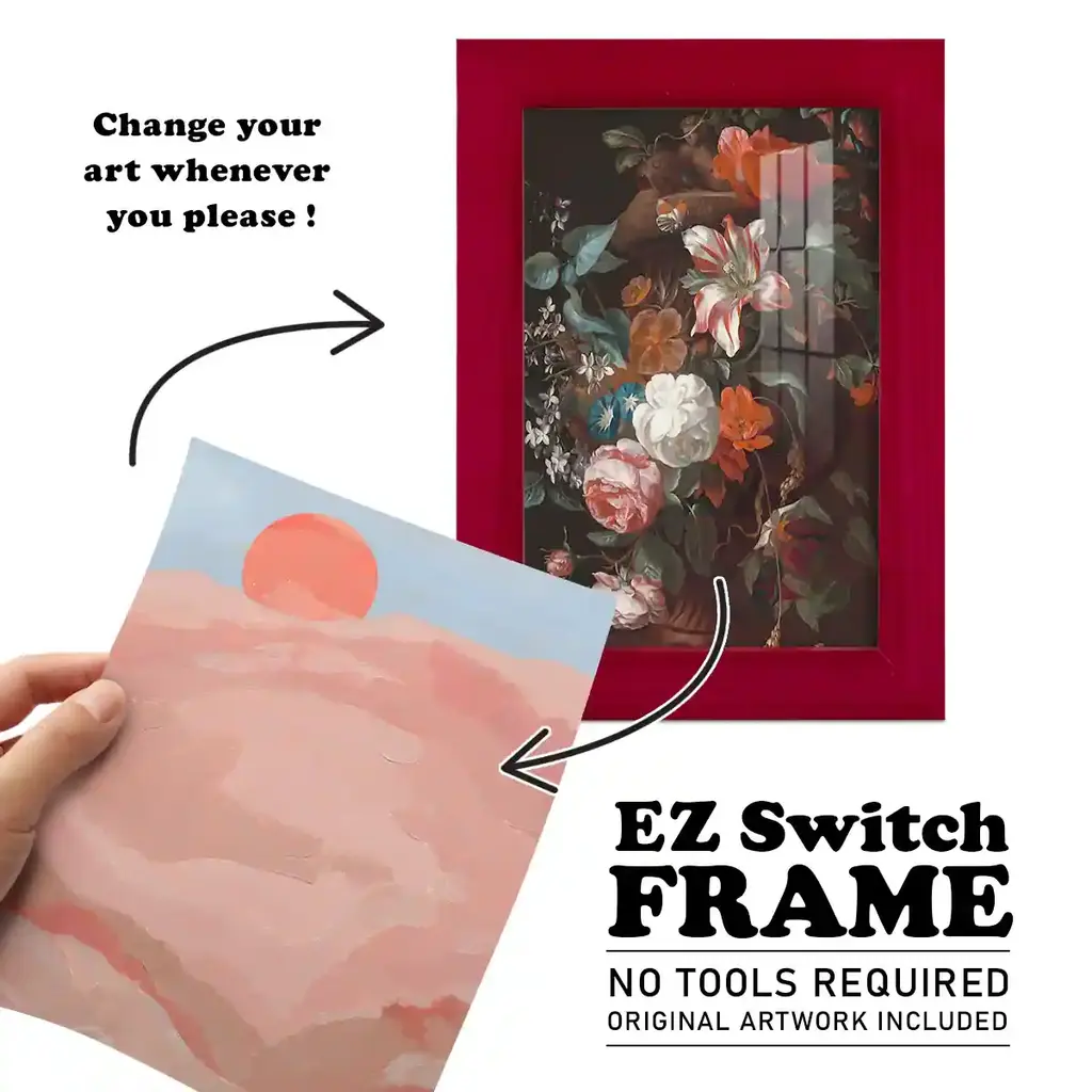 Summer Sun II -EZ SWITCH Framed Print w/glass-Cherry Red A delightful, framed print. Featuring a solid wood frame with real wood glass. This premium print is giclee quality. In addition, every frame features a removable back and table top stand. This allows you to change your art in the future or to just stand the art on a table for a new look. We are sure you'll enjoy our new series of EZ SWITCH Framed Art. Solid Wood Frame Real Glass Removable / Replaceable Art Built in Tabletop Stand Sizes range from 4x6 up to 12x15 - buy just one or pair them up as sets as you see fit.