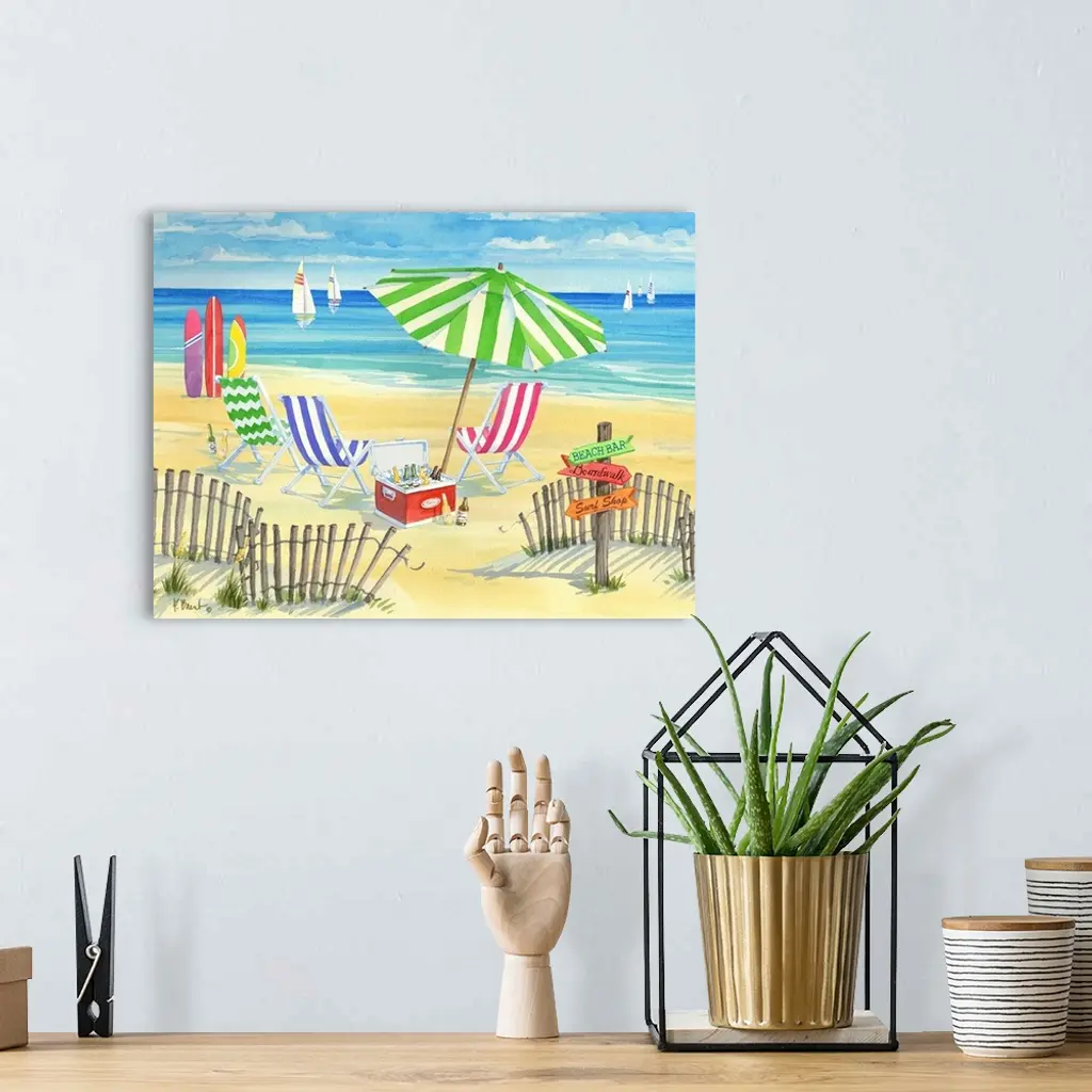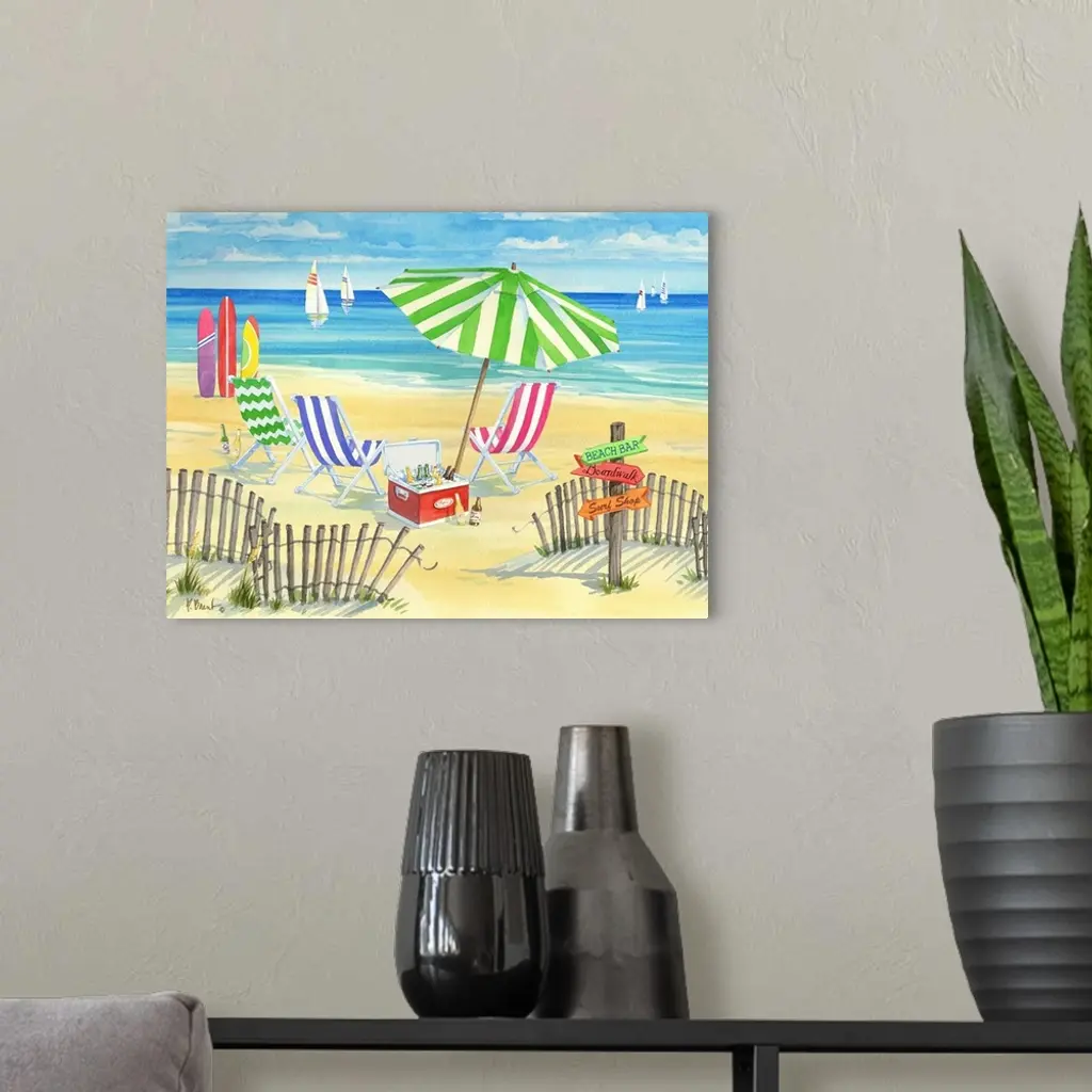 Watercolor painting of a peaceful ocean scene with striped umbrellas and beach chairs in the sand.