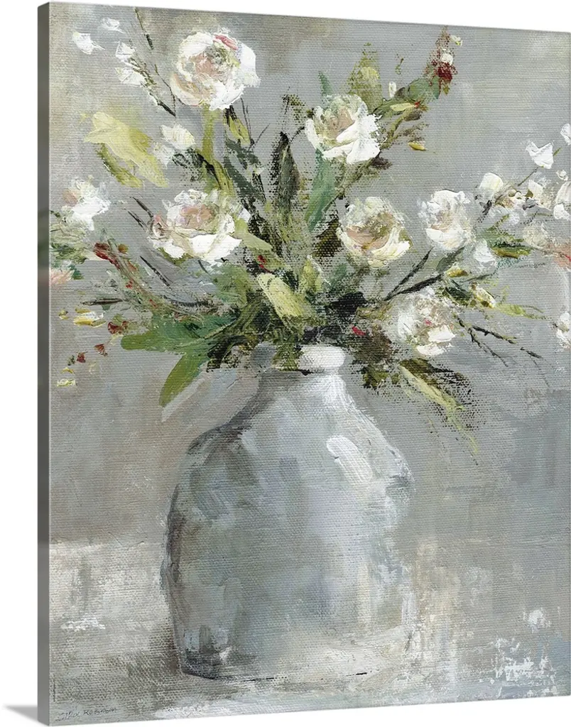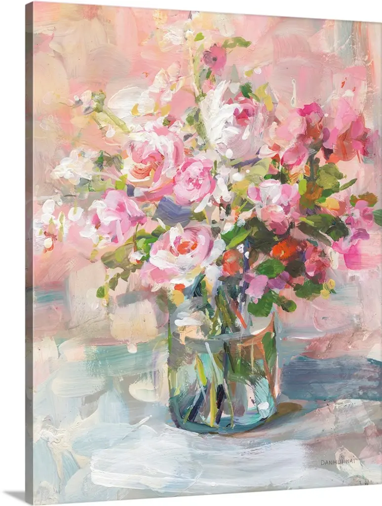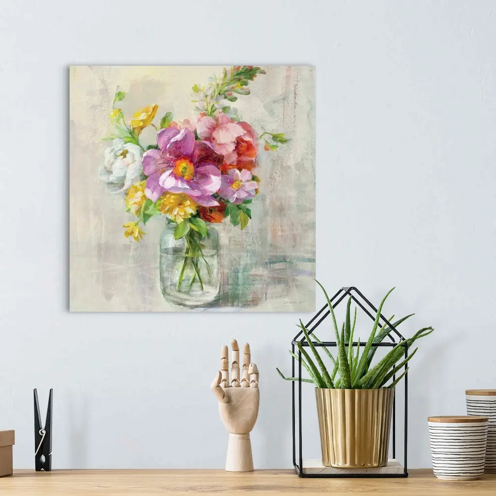 Contemporary home decor artwork of a bouquet of colorful flowers in a mason jar.