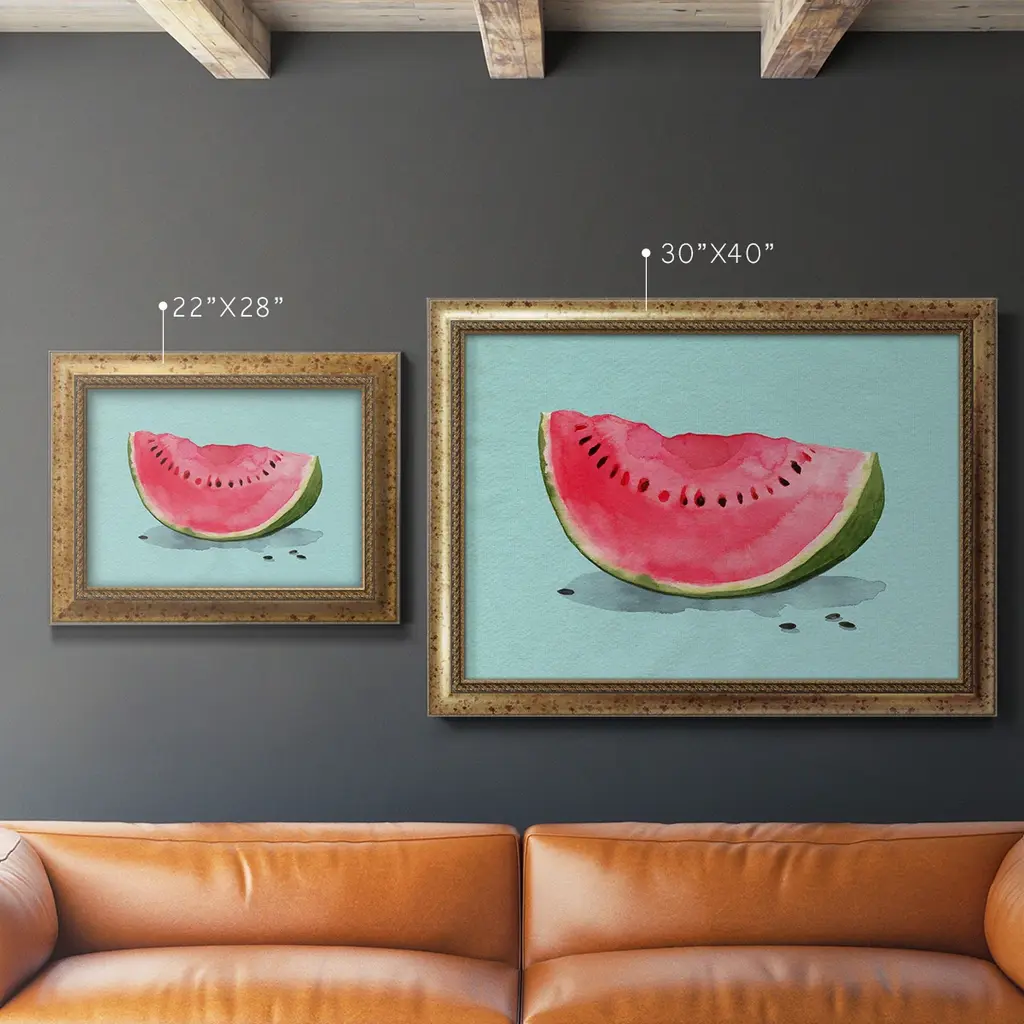 Summer Watermelon I Premium Framed Canvas- Ready to Hang A Premium Framed Canvas created to last. Framed in distressed wood and available in an array of sizes and colors Featuring a beveled a solid wood stretcher bar, each piece comes ready to hand 3 SIZES AVAILABLE 16''X20'' - Overall Size 18'X27'' - Overall Size 24''x36'' - Overall Size Each piece is made to order. Each piece comes with hanging hardware. Made in the USA Ready to Hang Giclee Paper Print Acrylic Glass Beveled Matt Board