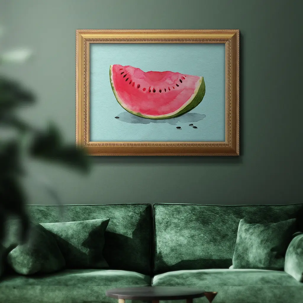 Summer Watermelon I Premium Framed Canvas- Ready to Hang A Premium Framed Canvas created to last. Framed in distressed wood and available in an array of sizes and colors Featuring a beveled a solid wood stretcher bar, each piece comes ready to hand 3 SIZES AVAILABLE 16''X20'' - Overall Size 18'X27'' - Overall Size 24''x36'' - Overall Size Each piece is made to order. Each piece comes with hanging hardware. Made in the USA Ready to Hang Giclee Paper Print Acrylic Glass Beveled Matt Board