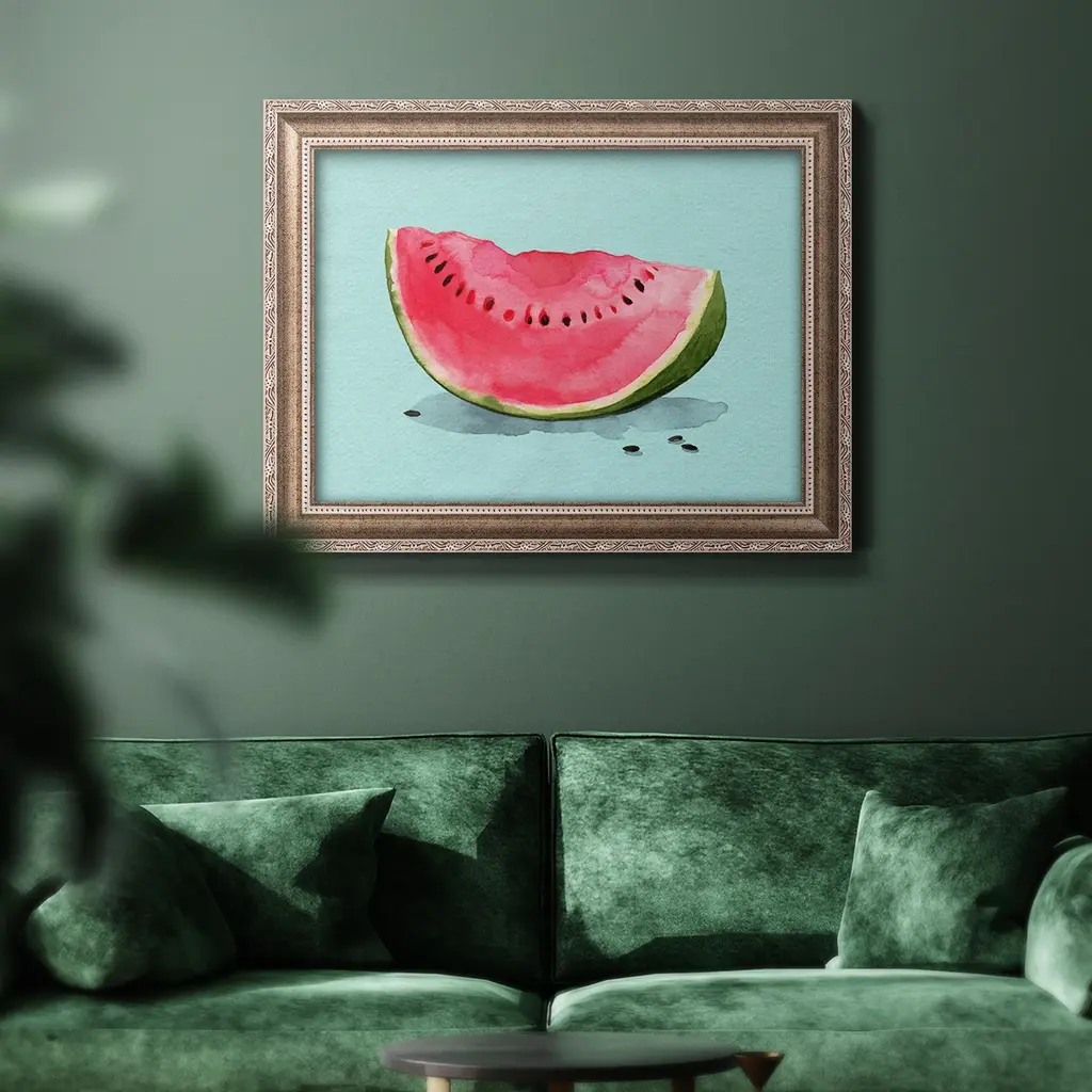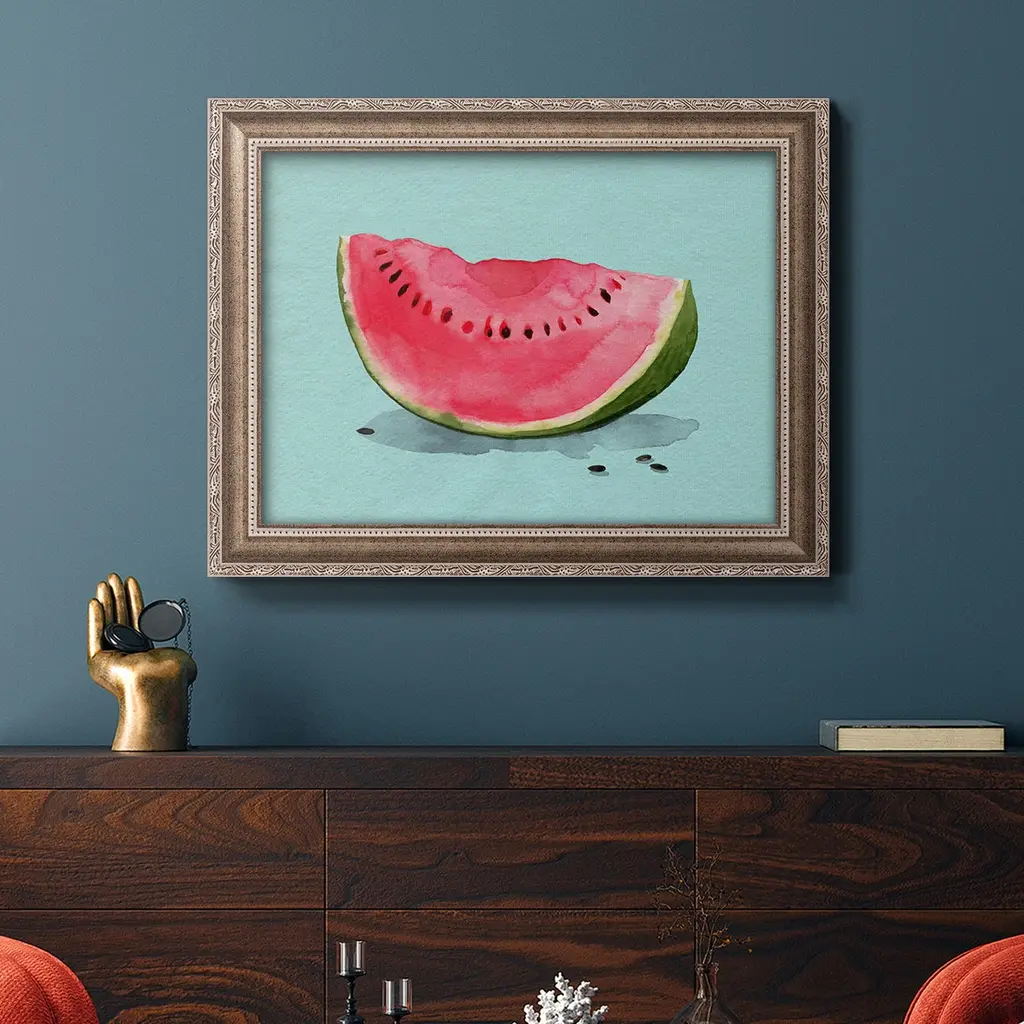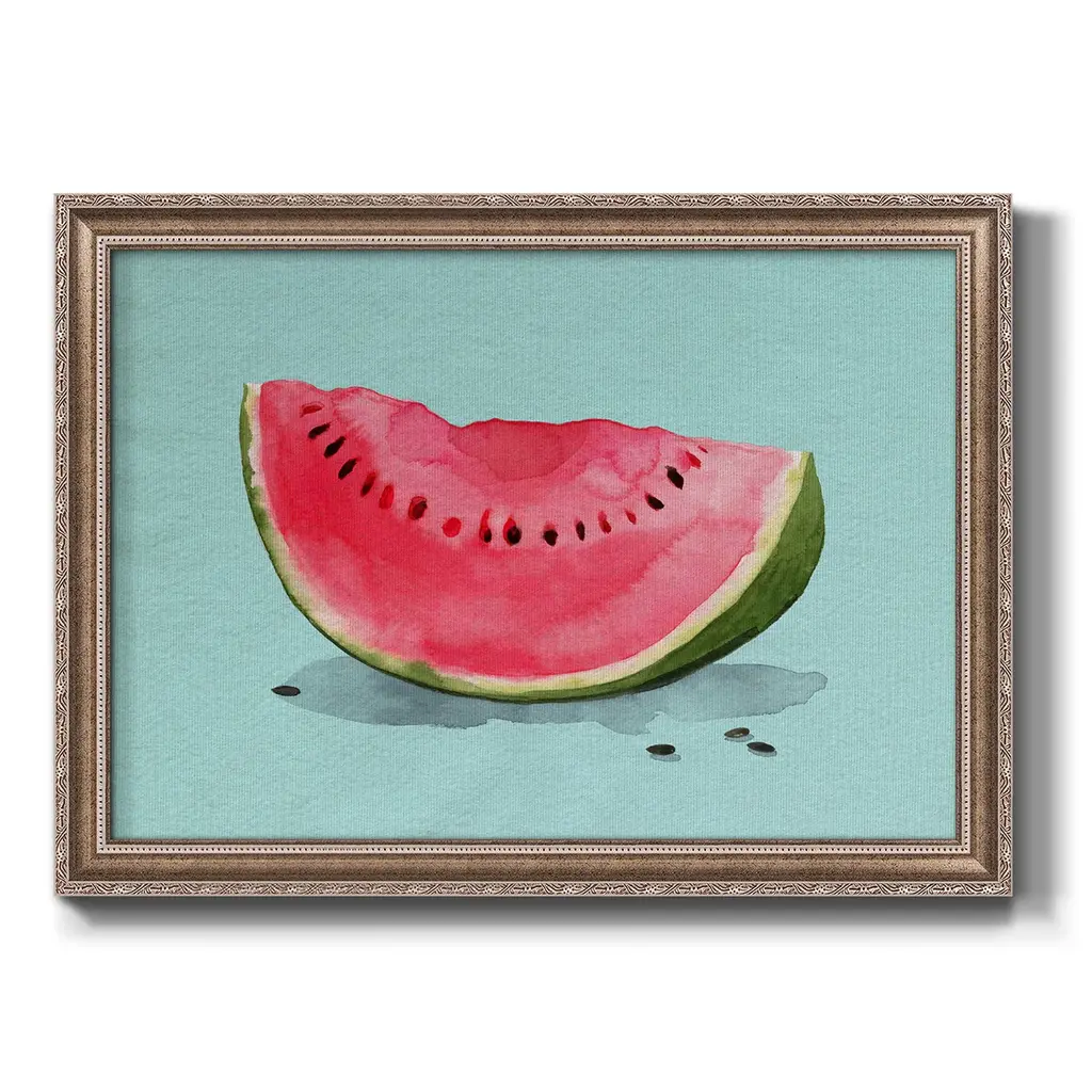 Summer Watermelon I Premium Framed Canvas- Ready to Hang A Premium Framed Canvas created to last. Framed in distressed wood and available in an array of sizes and colors Featuring a beveled a solid wood stretcher bar, each piece comes ready to hand 3 SIZES AVAILABLE 16''X20'' - Overall Size 18'X27'' - Overall Size 24''x36'' - Overall Size Each piece is made to order. Each piece comes with hanging hardware. Made in the USA Ready to Hang Giclee Paper Print Acrylic Glass Beveled Matt Board