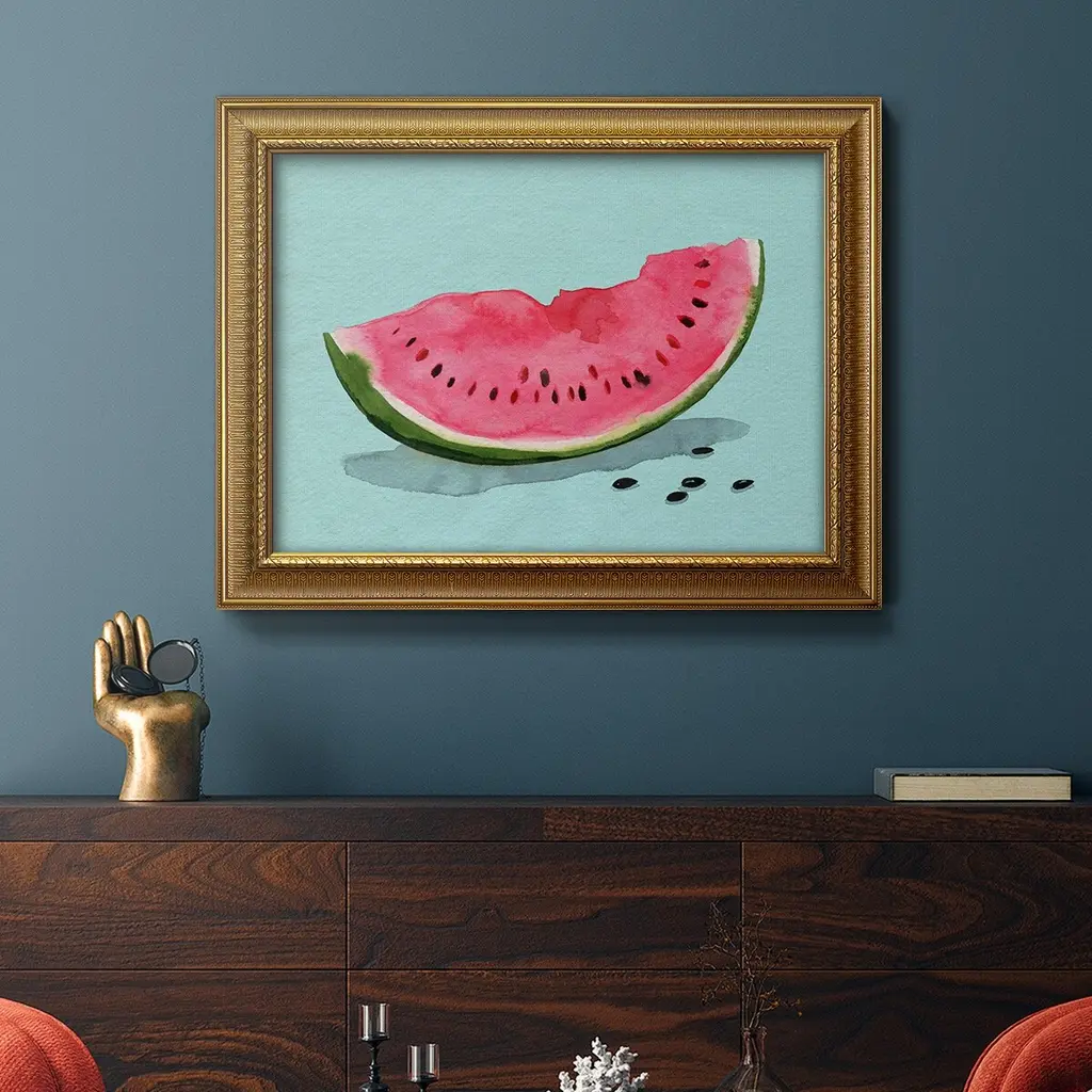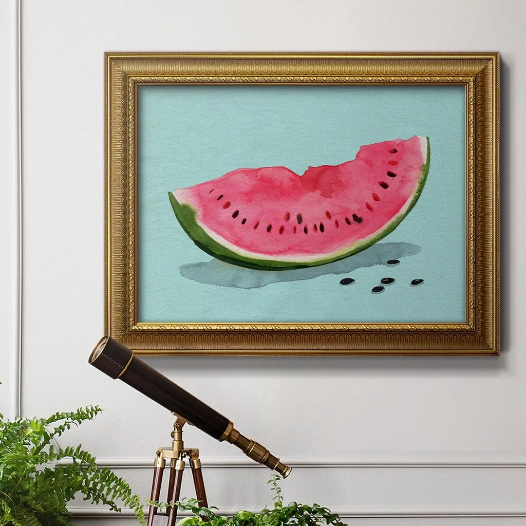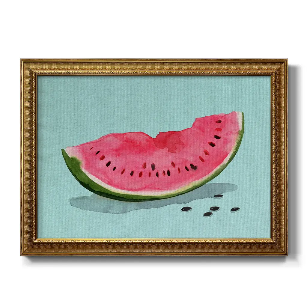 Summer Watermelon II Premium Framed Canvas- Ready to Hang A Premium Framed Canvas created to last. Framed in distressed wood and available in an array of sizes and colors Featuring a beveled a solid wood stretcher bar, each piece comes ready to hand 3 SIZES AVAILABLE 16''X20'' - Overall Size 18'X27'' - Overall Size 24''x36'' - Overall Size Each piece is made to order. Each piece comes with hanging hardware. Made in the USA Ready to Hang Giclee Paper Print Acrylic Glass Beveled Matt Board