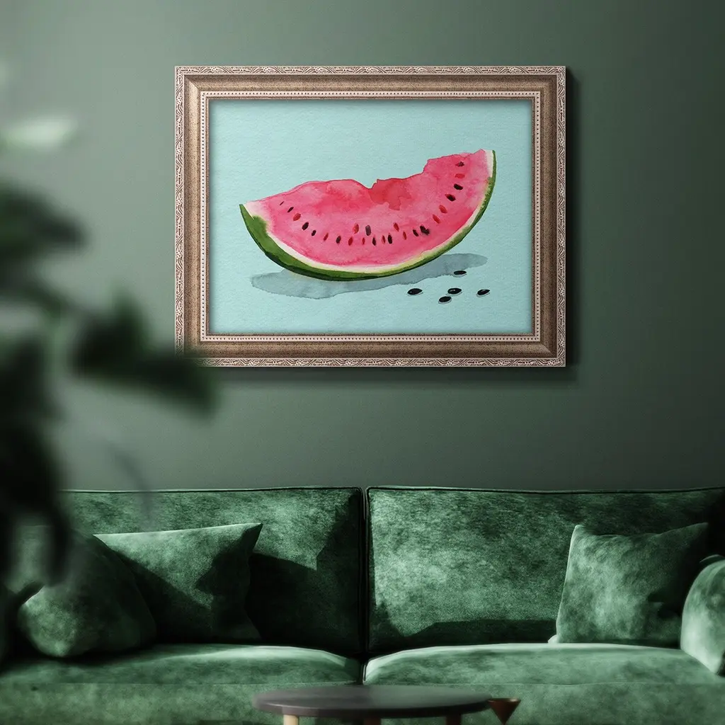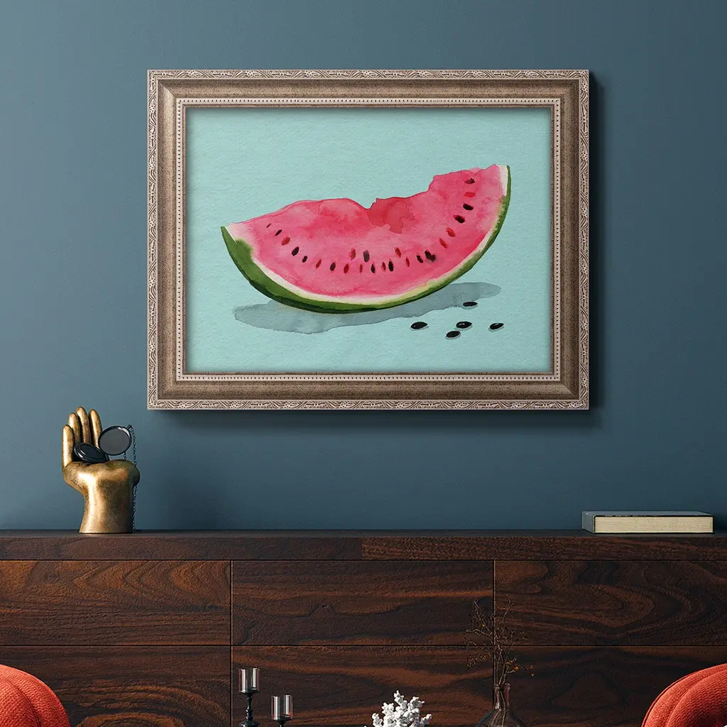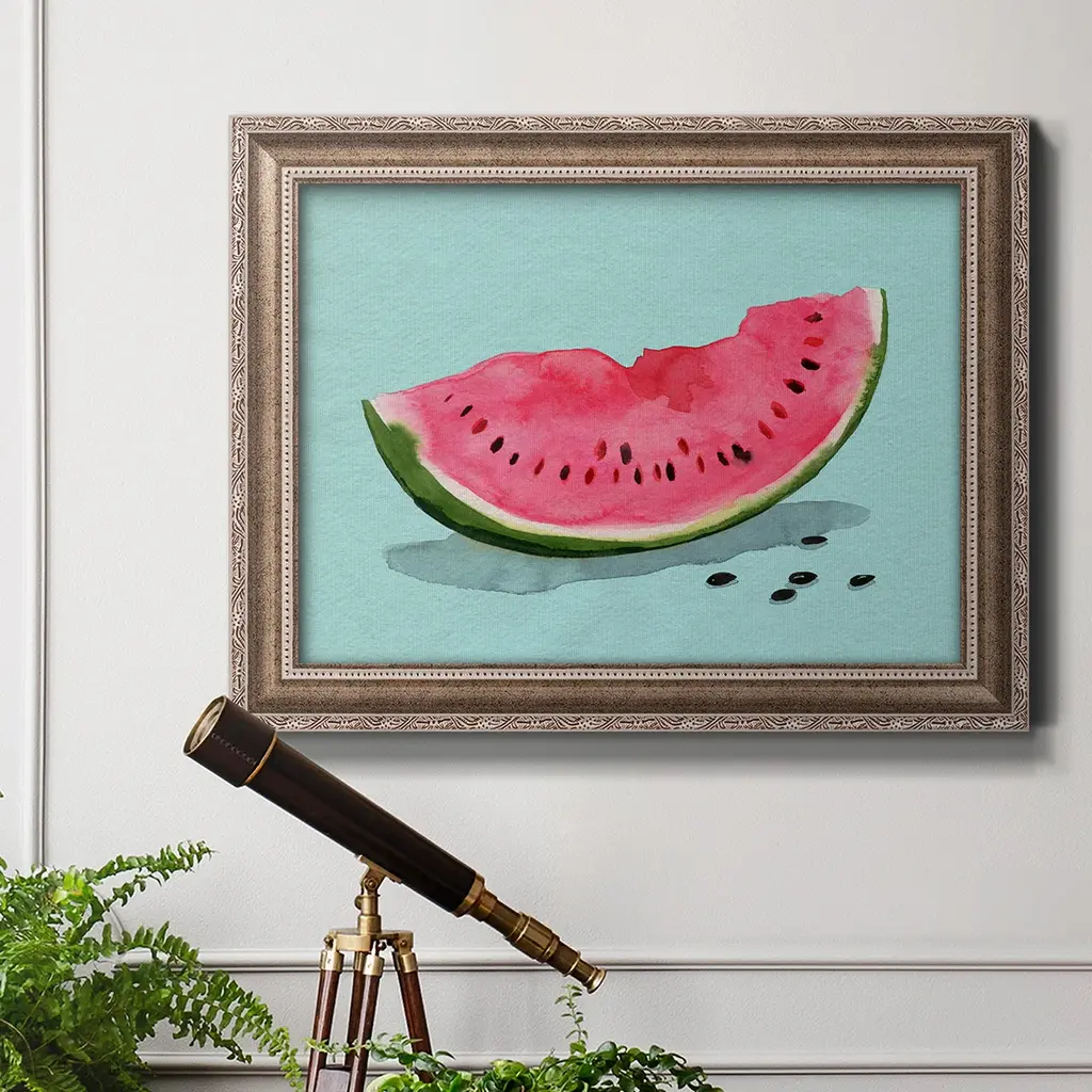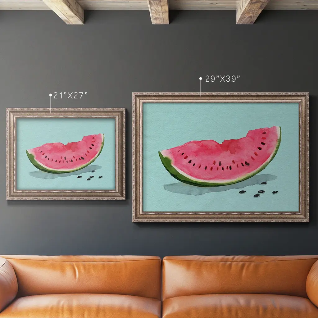 Summer Watermelon II Premium Framed Canvas- Ready to Hang A Premium Framed Canvas created to last. Framed in distressed wood and available in an array of sizes and colors Featuring a beveled a solid wood stretcher bar, each piece comes ready to hand 3 SIZES AVAILABLE 16''X20'' - Overall Size 18'X27'' - Overall Size 24''x36'' - Overall Size Each piece is made to order. Each piece comes with hanging hardware. Made in the USA Ready to Hang Giclee Paper Print Acrylic Glass Beveled Matt Board