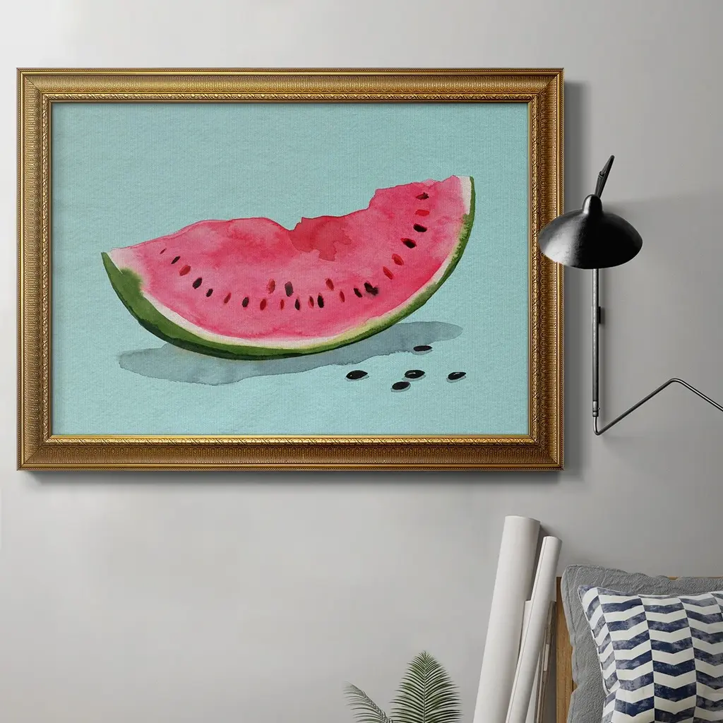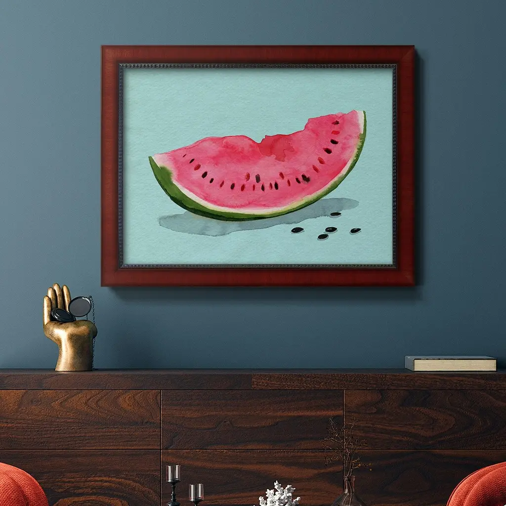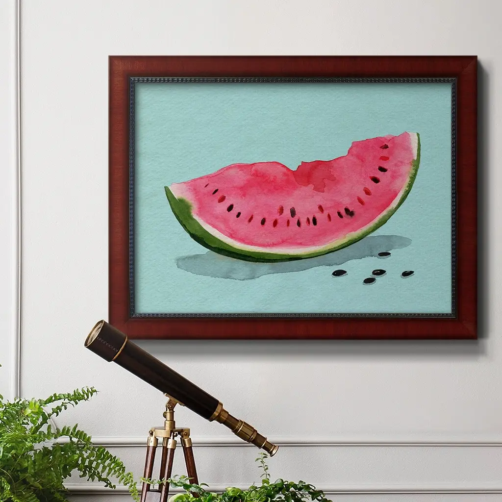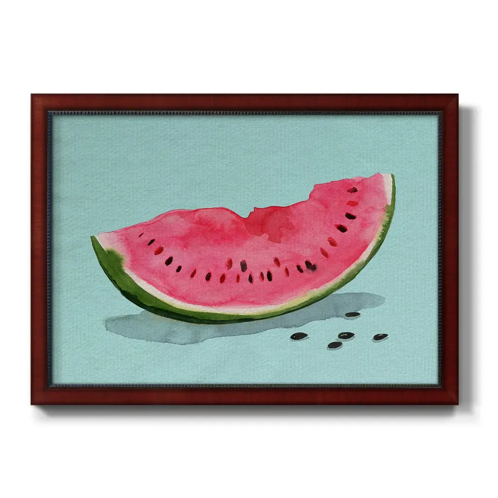 Summer Watermelon II Premium Framed Canvas- Ready to Hang A Premium Framed Canvas created to last. Framed in distressed wood and available in an array of sizes and colors Featuring a beveled a solid wood stretcher bar, each piece comes ready to hand 3 SIZES AVAILABLE 16''X20'' - Overall Size 18'X27'' - Overall Size 24''x36'' - Overall Size Each piece is made to order. Each piece comes with hanging hardware. Made in the USA Ready to Hang Giclee Paper Print Acrylic Glass Beveled Matt Board