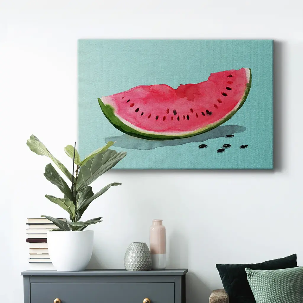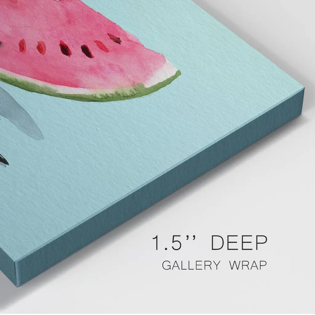 Summer Watermelon II Premium Gallery Wrapped Canvas - Ready to Hang A premium hand stretched gallery wrapped canvas print created to last. Featuring a beveled a solid wood stretcher bar, each piece comes ready to hand 6 SIZES AVAILABLE 8''X12'' - Overall Size 12''X18'' - Overall Size 18''X27'' - Overall Size 24''x36'' - Overall Size 32''x48'' - Overall Size 40''x60'' - Overall Size Each piece is made to order. Built to Last Each piece comes ready to hang Solid wood stretcher Fade and Water resistant Made domestically