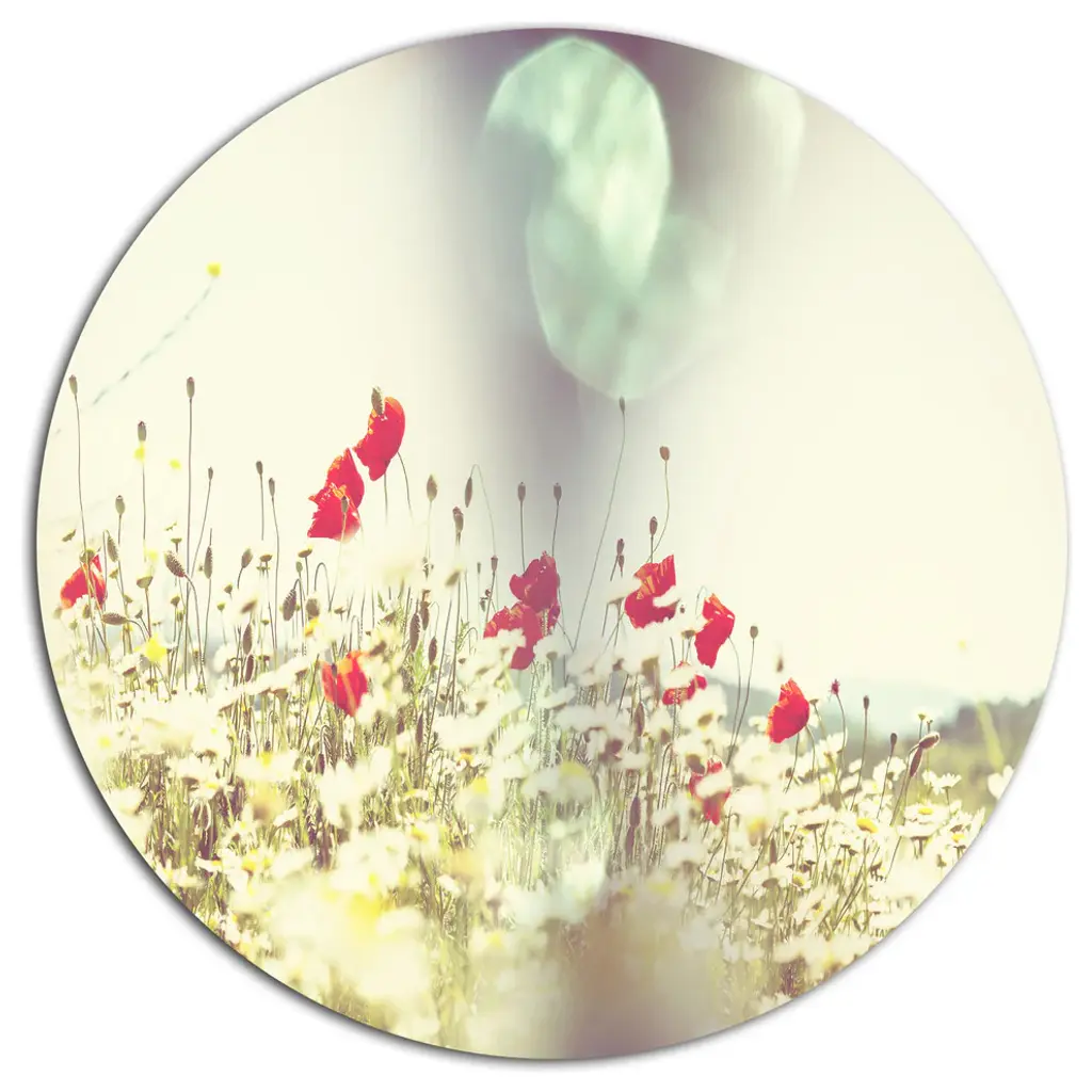 Bring Contemporary Abstraction to your home with this large Circle Metal wall art. This Summer Wild Flowers and Grass Metal Artwork makes it the focal point of any room or office. - White Gloss Coating ensures colors are extra vibrant with light reflection.- Aluminum grade Sheet Metal with 1 inch mounting frame on the back giving the illusion that the artwork is floating on the wall..- Mounting Brackets are included along with instructions.- High Quality Digital images are created directly into a glossy aluminum panel producing a stunning and captivating print into the glossy finish of the metal.- Water, Fire and Scratch resistant HD Aluminum panels.- Looks better than any photo paper and guaranteed to last at least 20 years- Easy to clean with a microfiber cloth. Colors are far superior to regular Canvas Art. - Easy to Hang