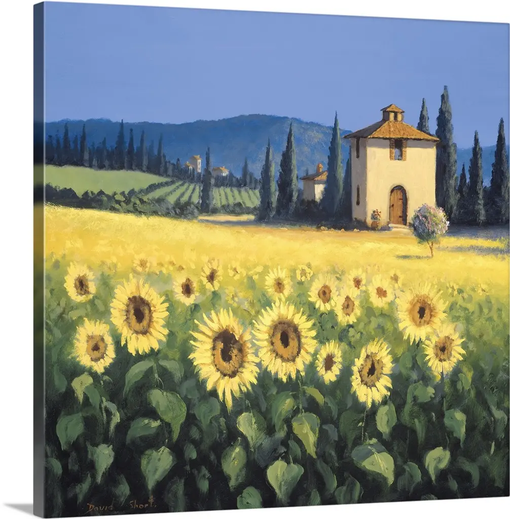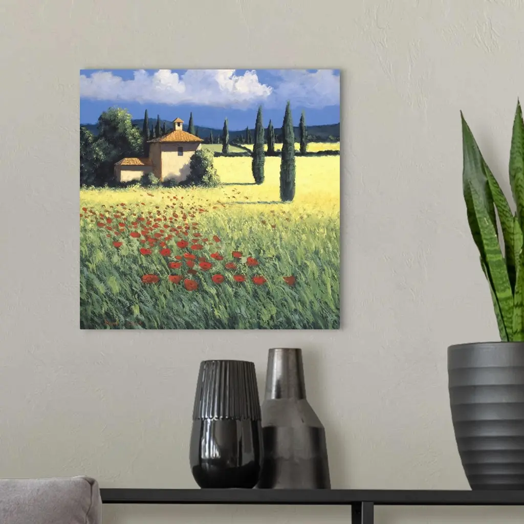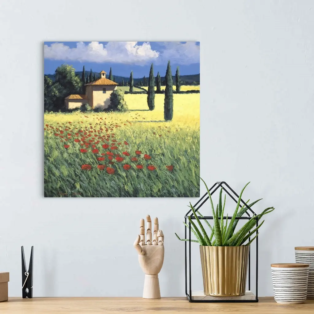 Painting of a field of poppies near a farm house in Tuscany.