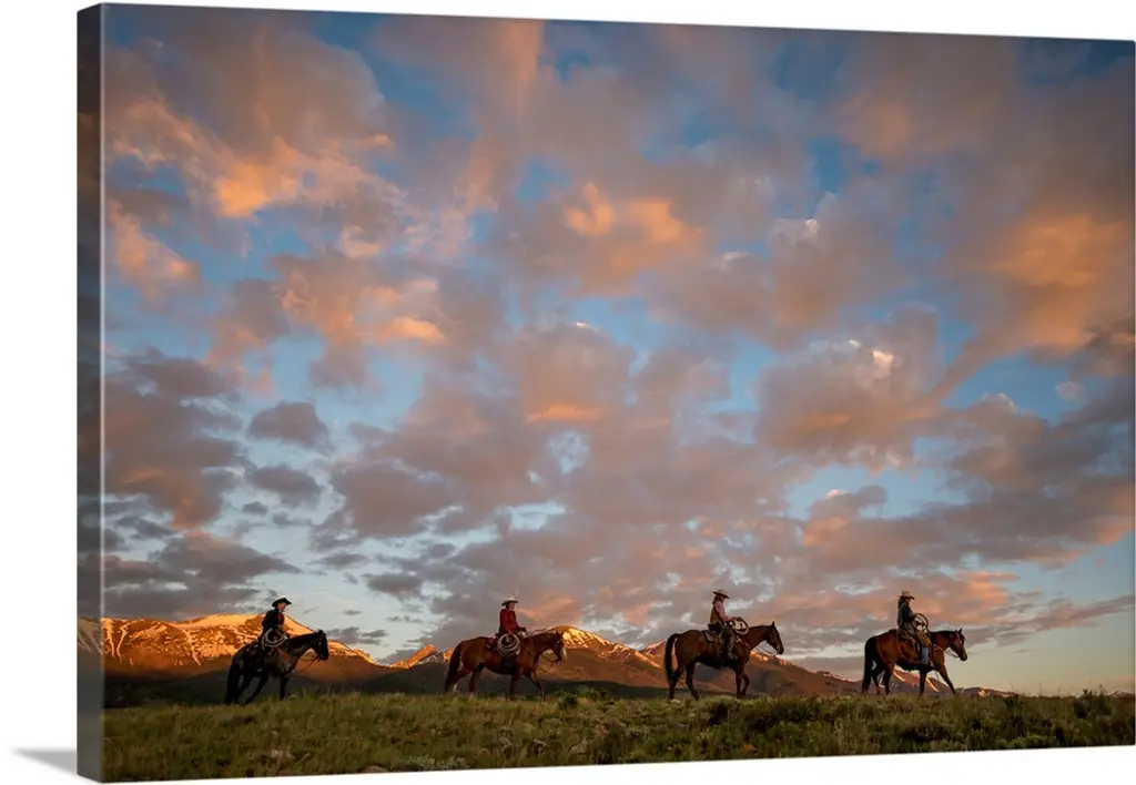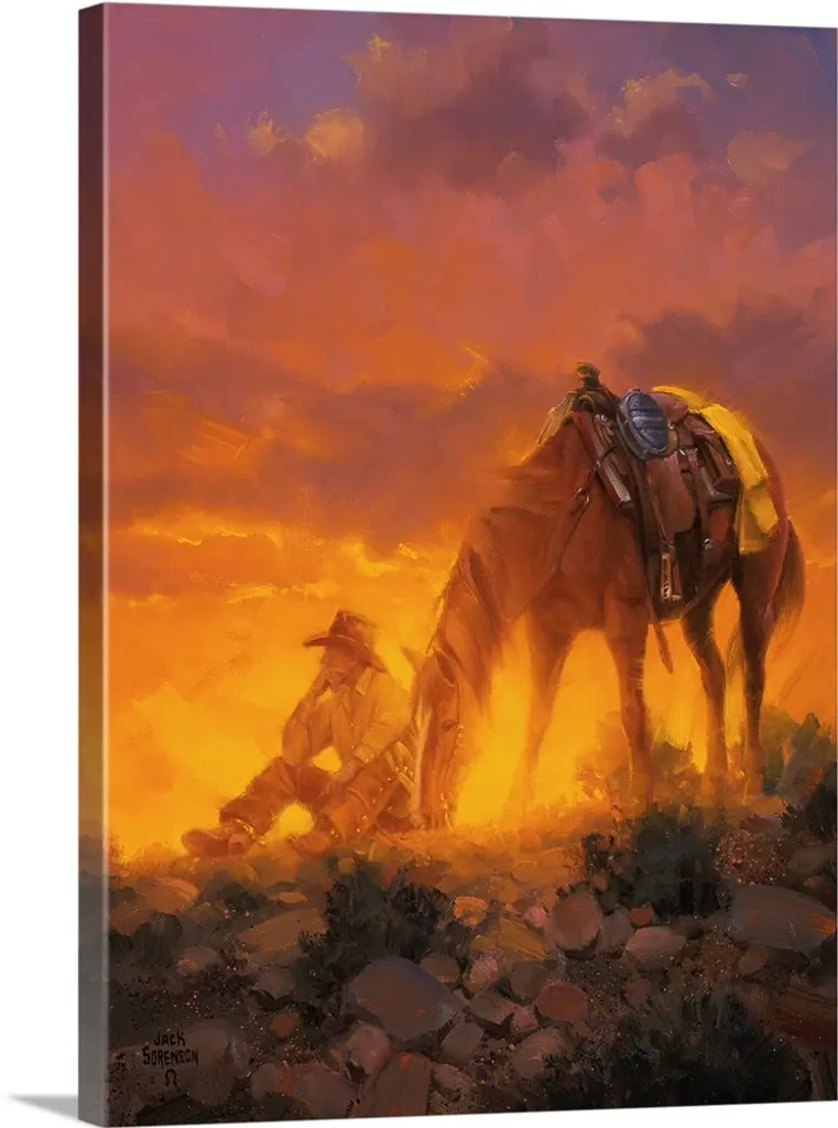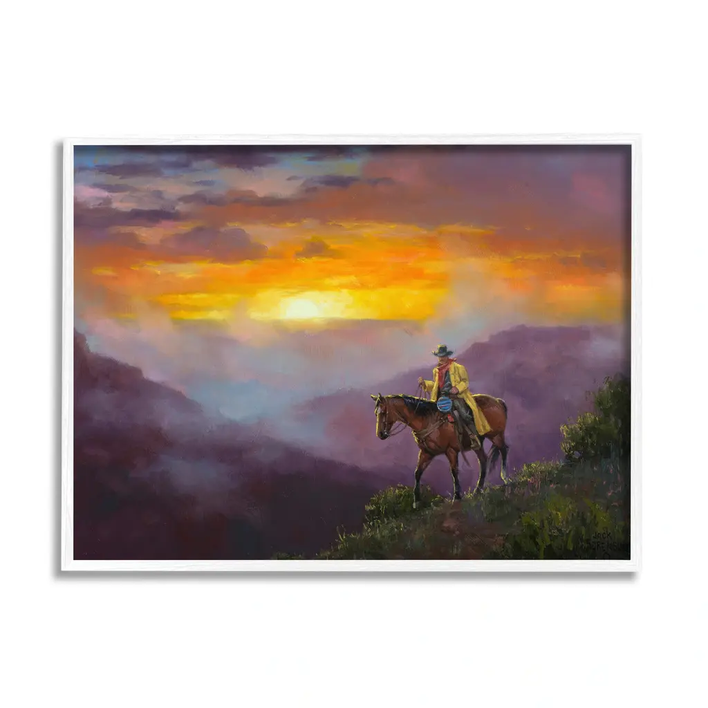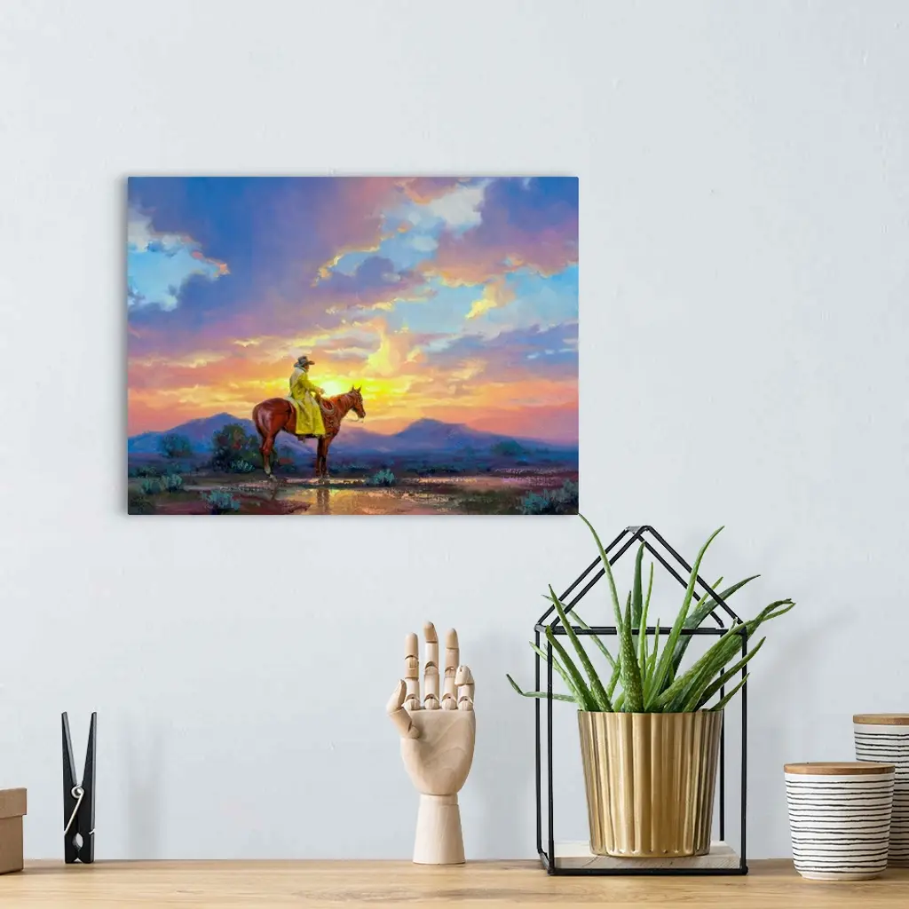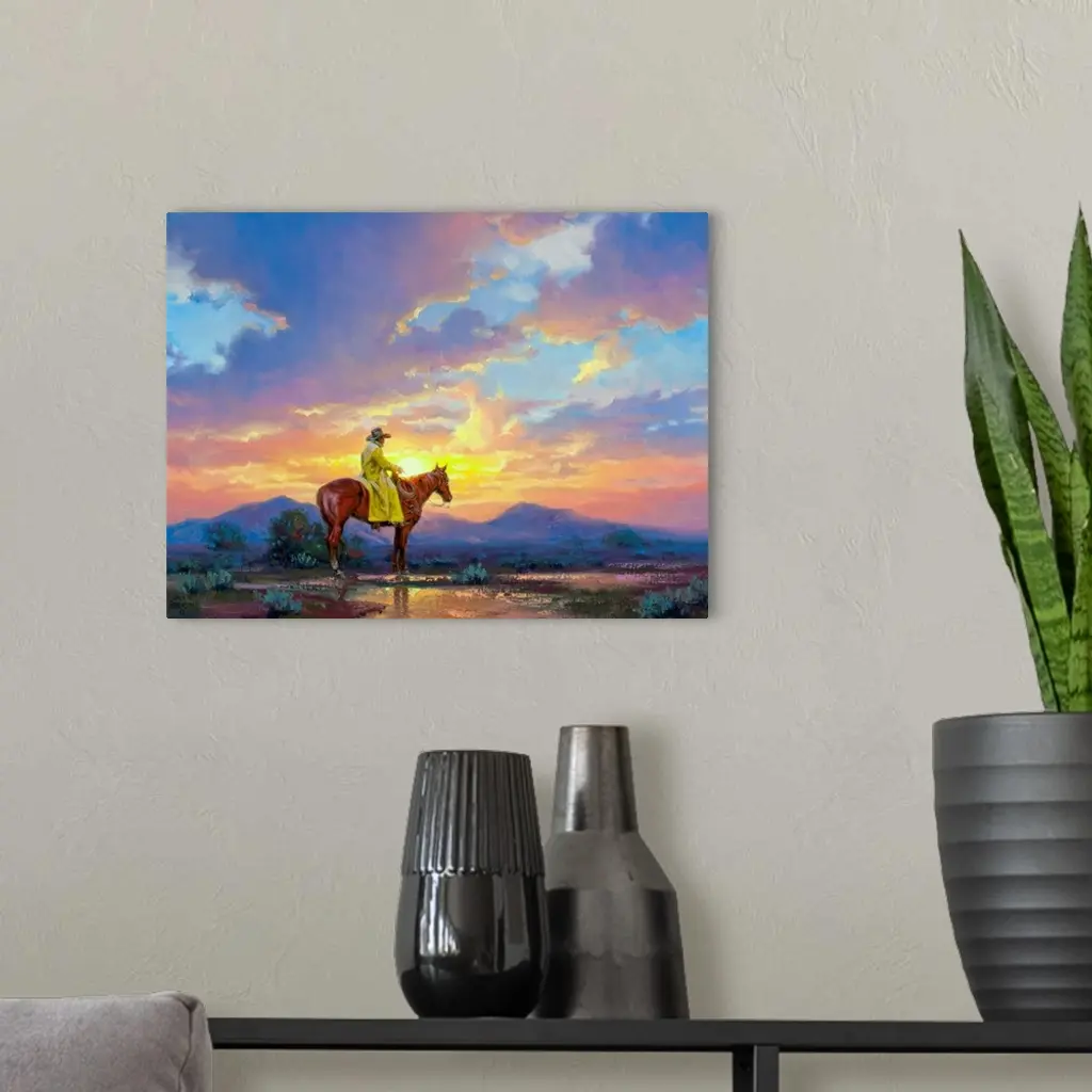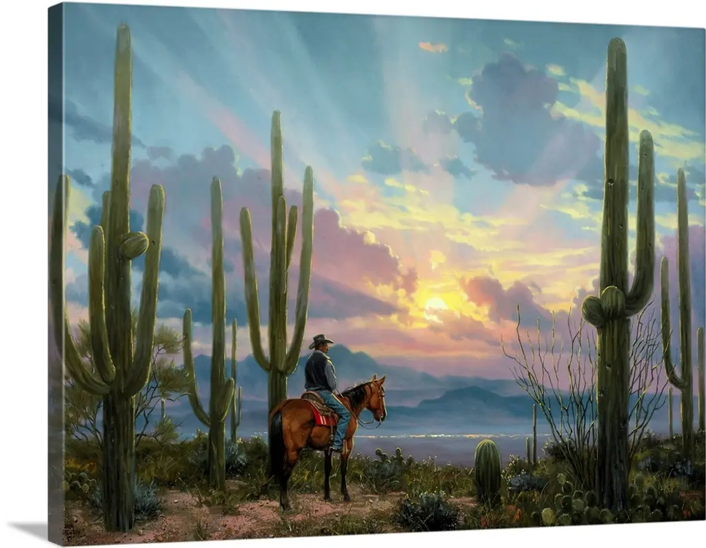Painting of man in trench coat on horse in desert at sunset. There are mountains in the distance.