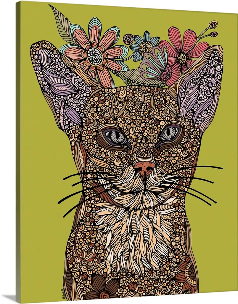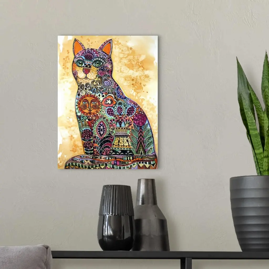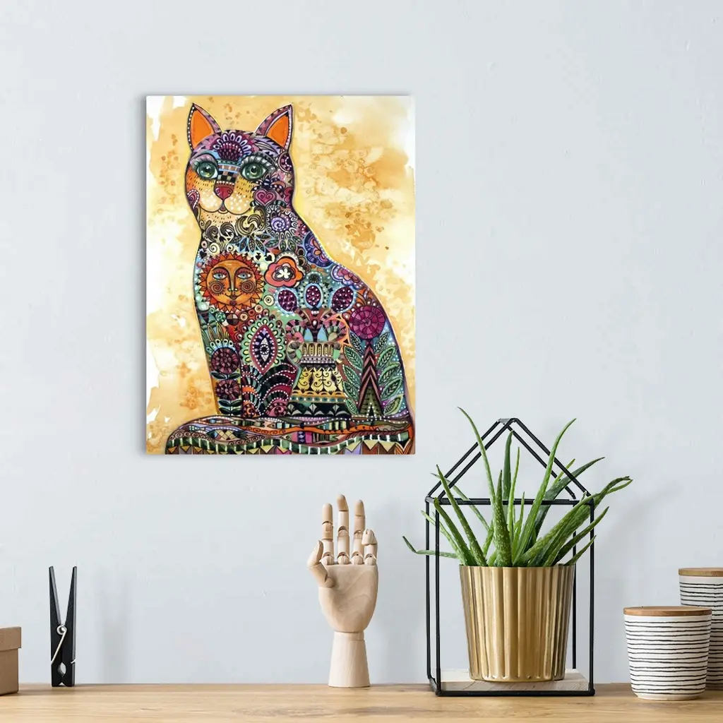 Watercolor painting of a cat decorated with floral patterns and a smiling sun.