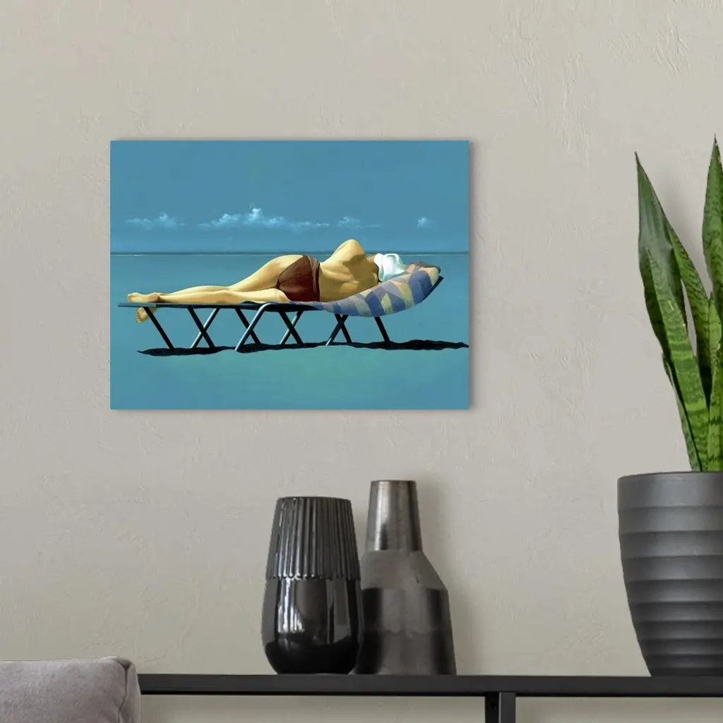 Contemporary oil painting of a woman sunbathing on a lounge chair by the water's edge.