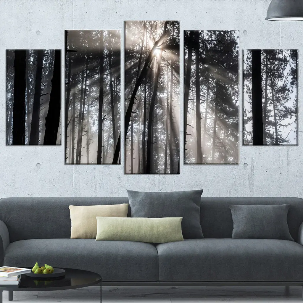"Sunbeams Through Black White Forest" Forest Wall Artwork Print, 5 Panels