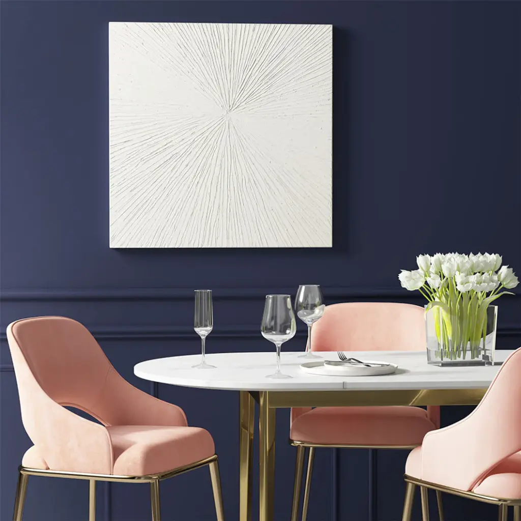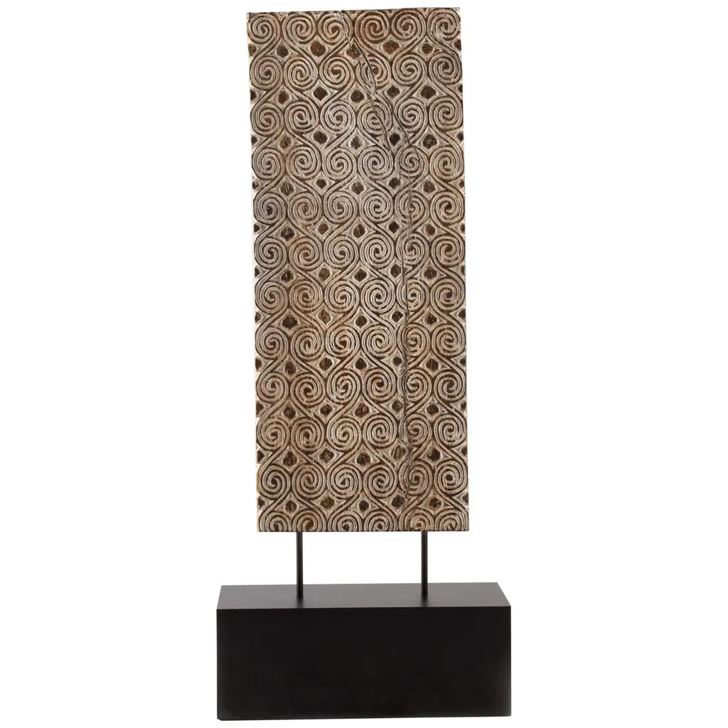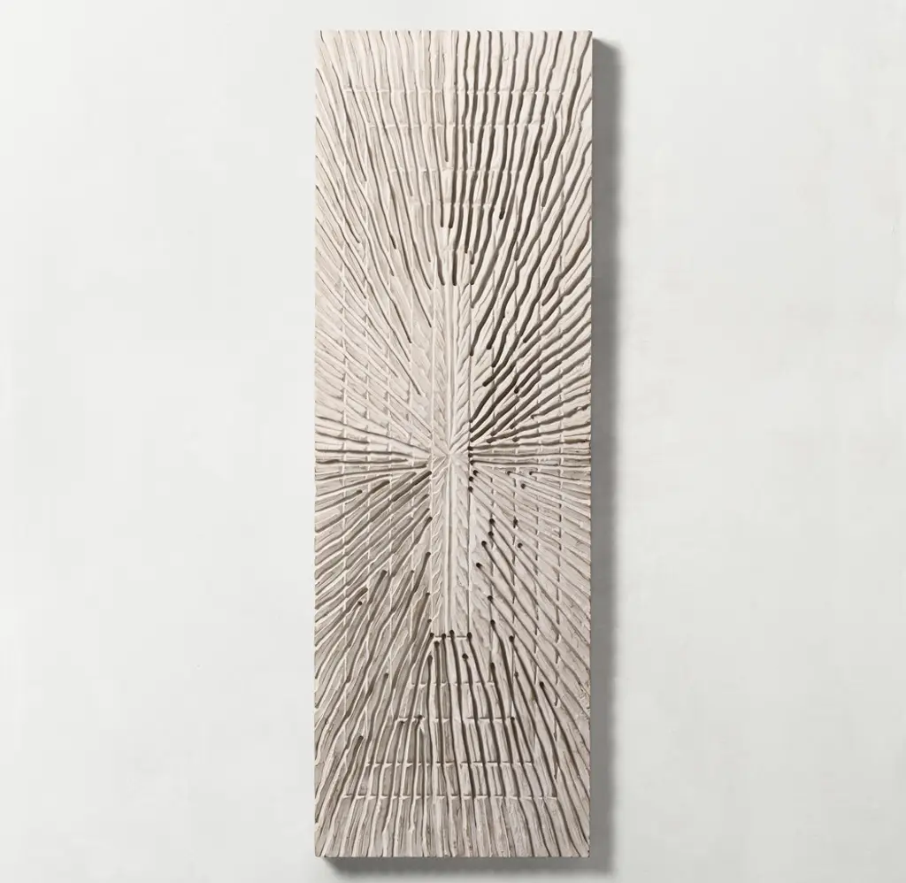 Hundreds of textural channels radiate out from the center of our wall hanging, carved by hand into the solid wood panel at purposeful angles to create a dynamic yet serene focal point.