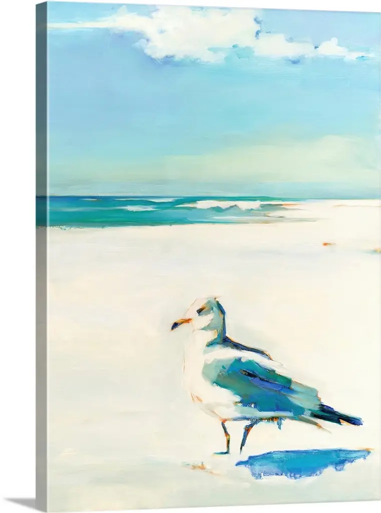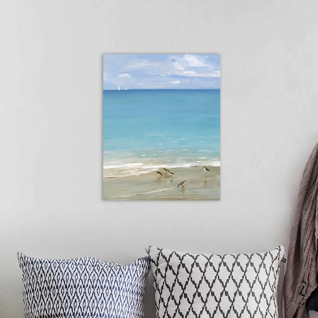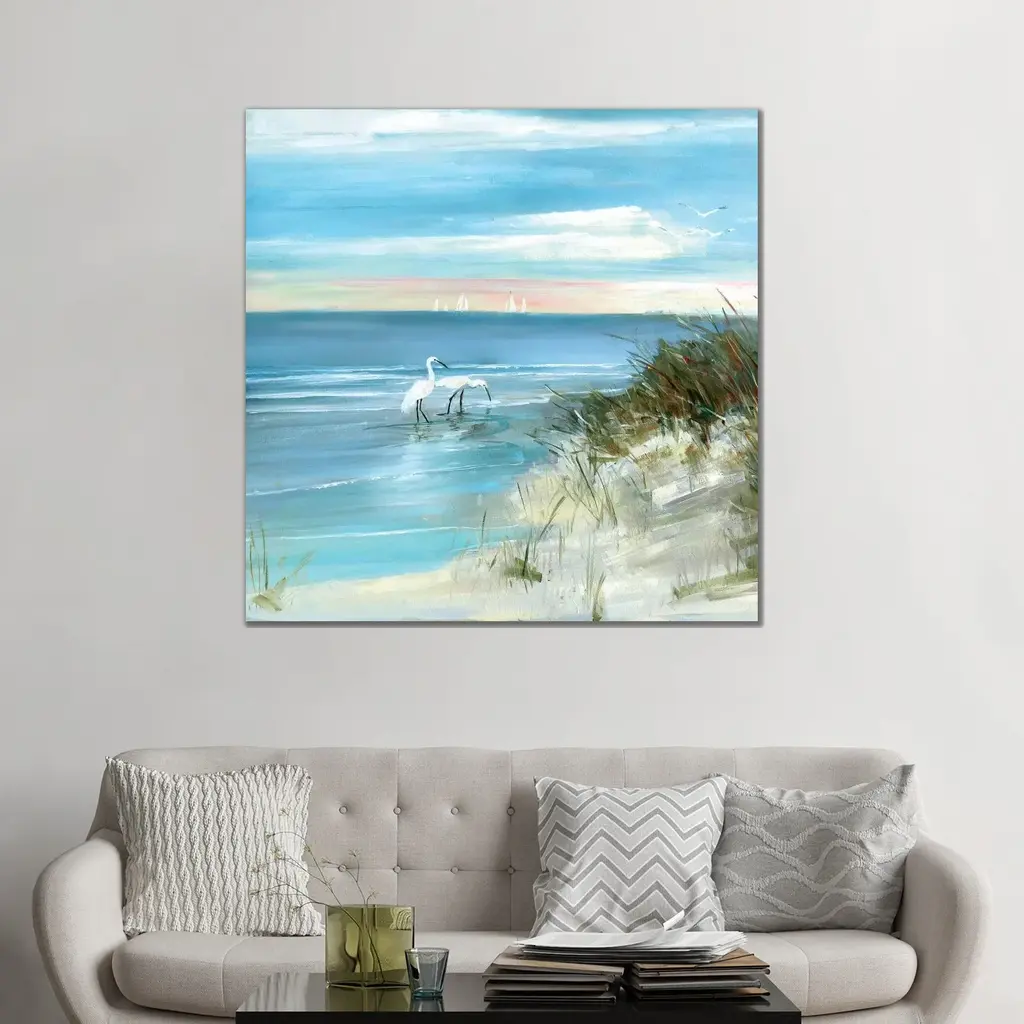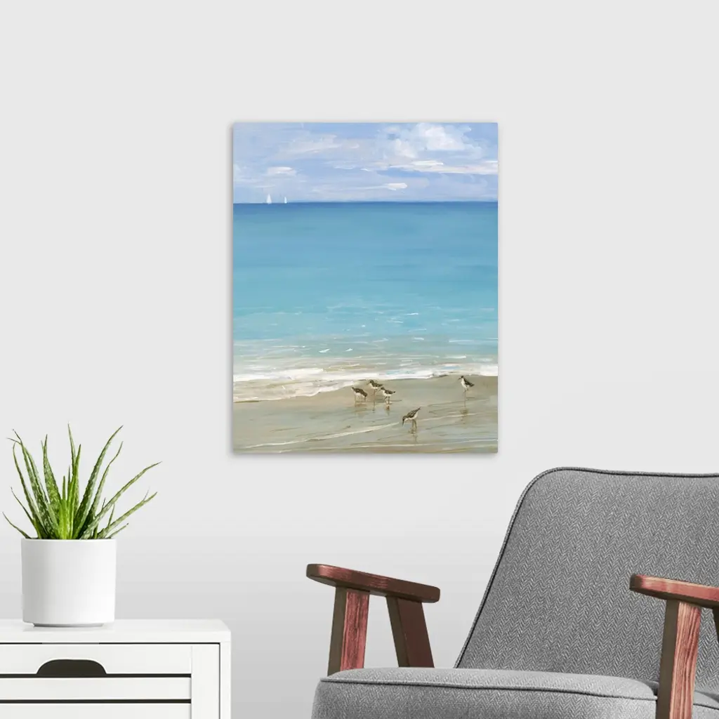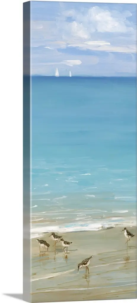 Contemporary painting of the seashore with seabirds in the foreground and two sailboats in the distance.