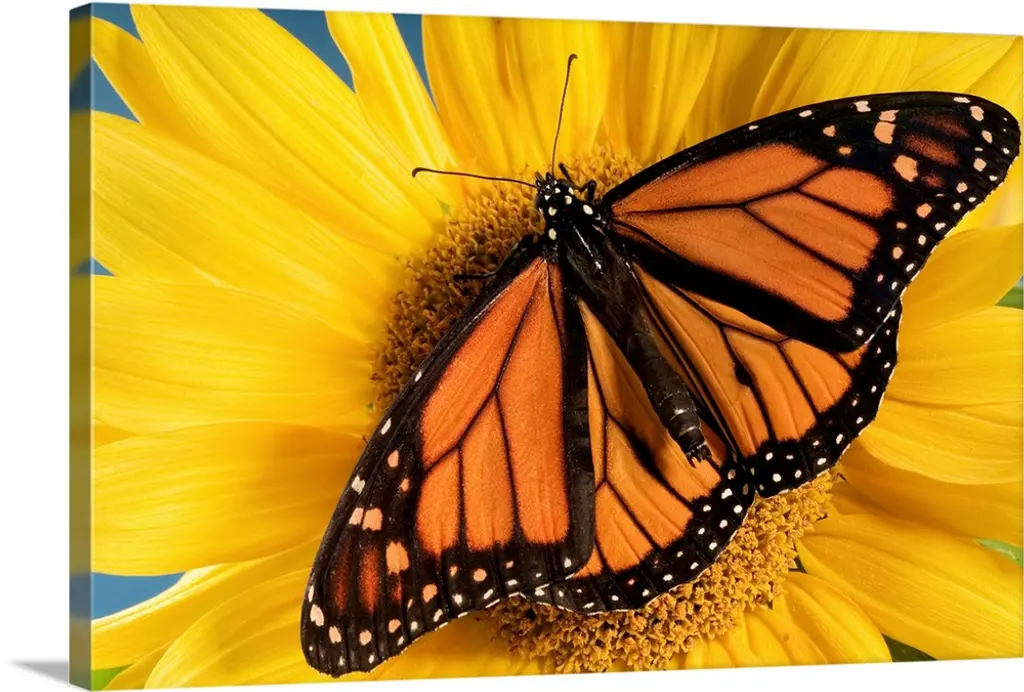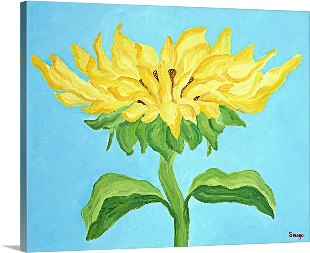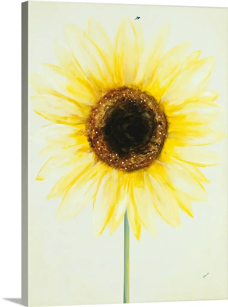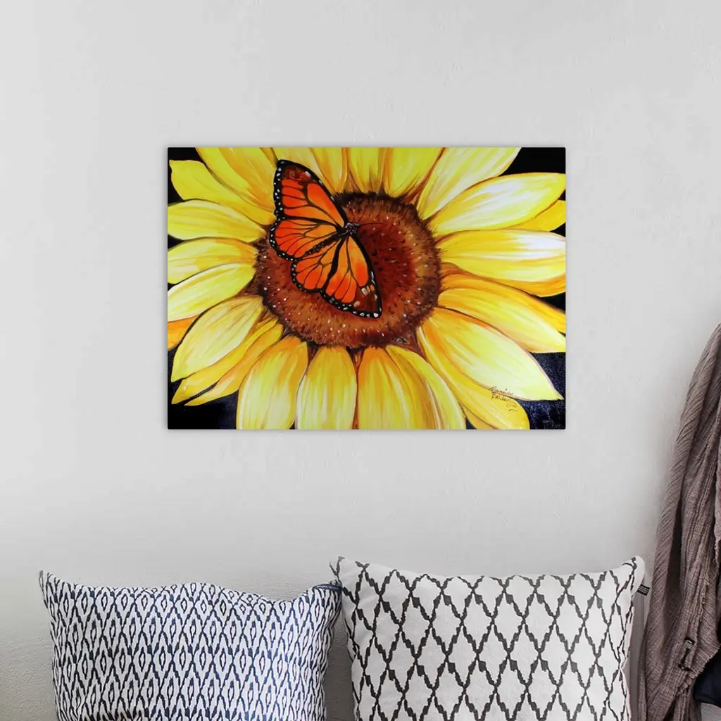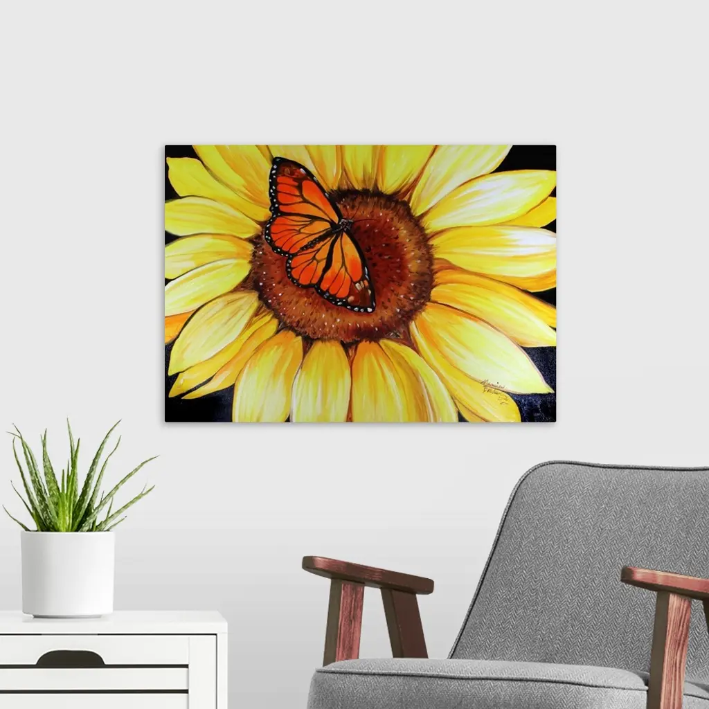 Contemporary painting of a sunflower with an orange butterfly in the center.