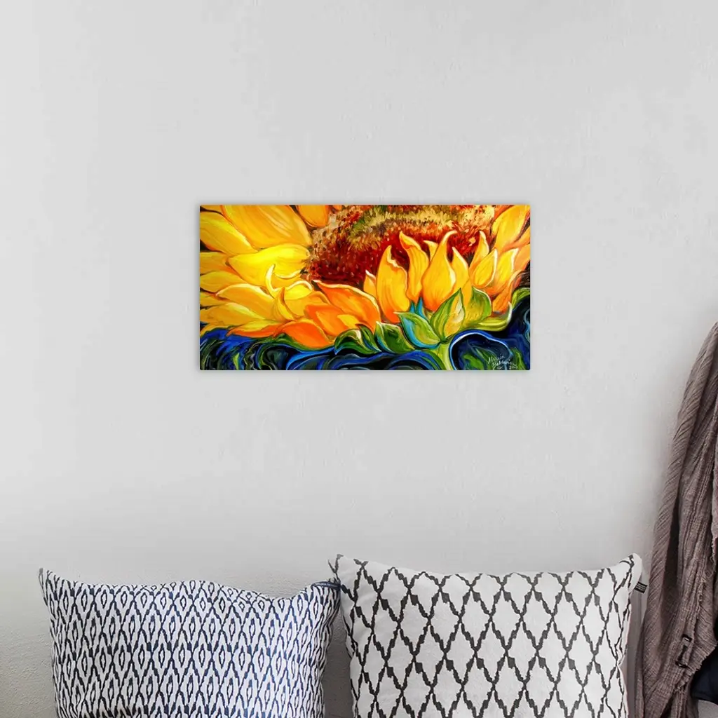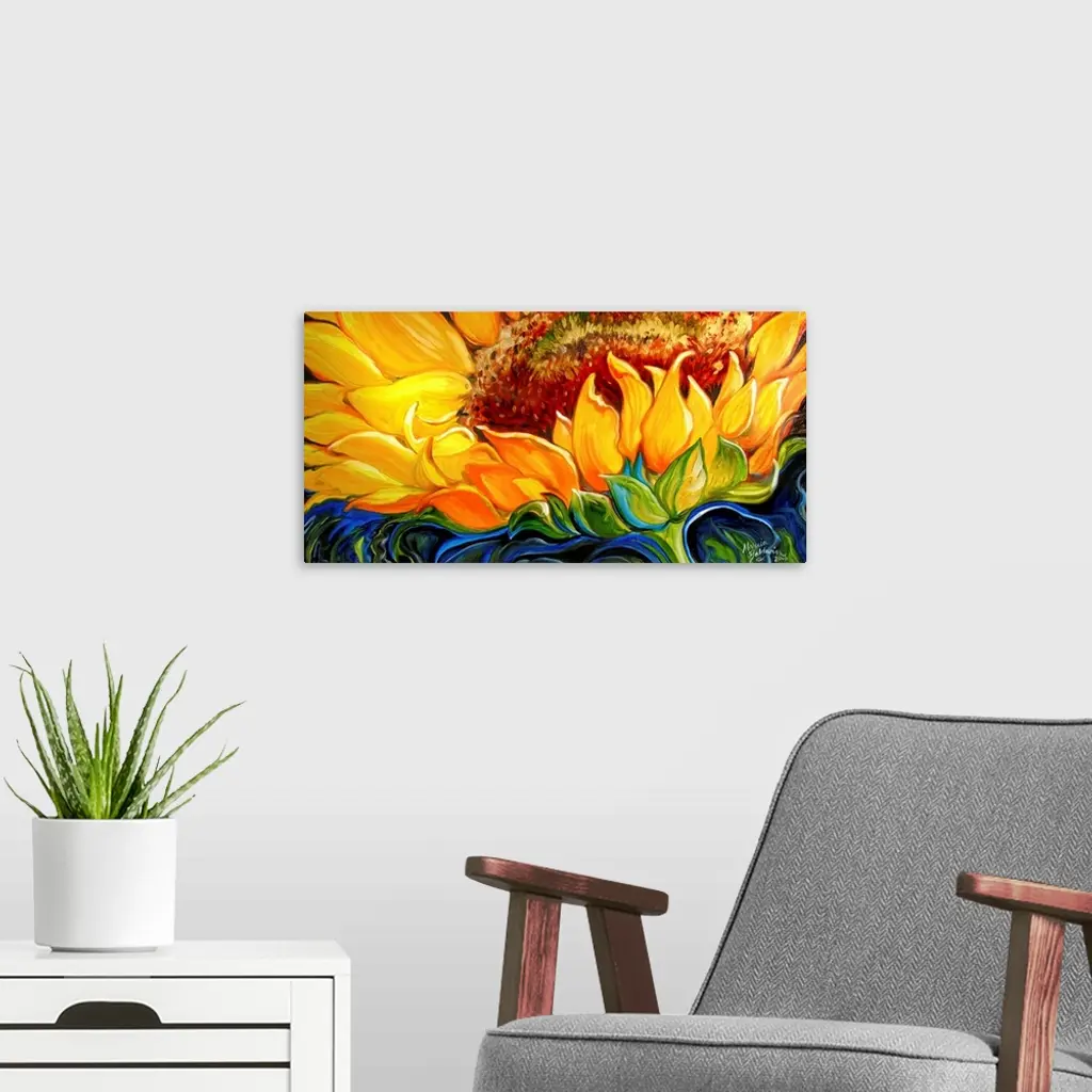 Wide painting of a sunflower close up with an abstract blue, black, and green background.