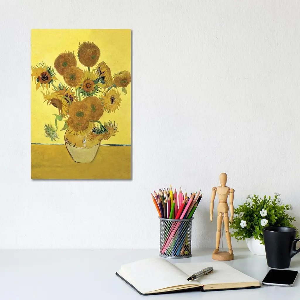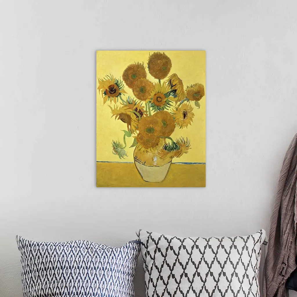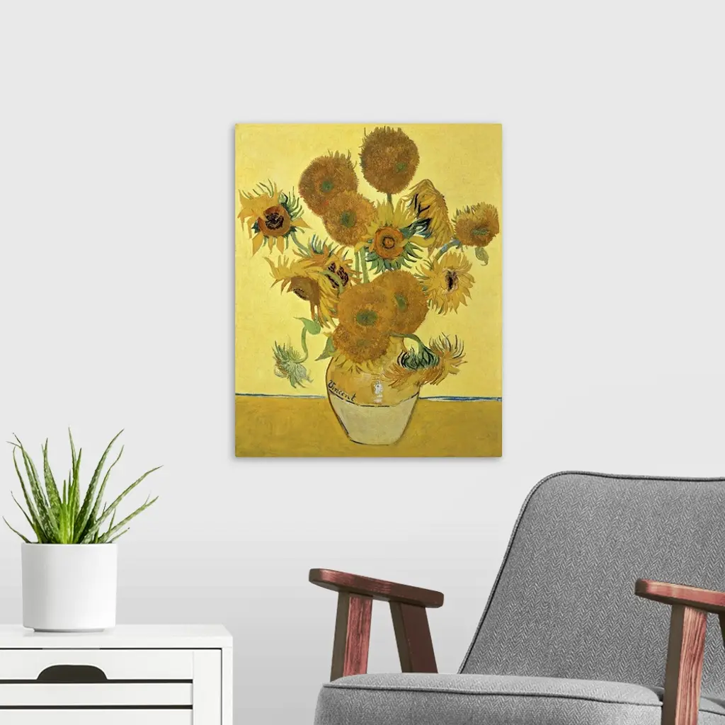 Vincent Van Gogh's famous oil on canvas painting of sunflowers in a vase in warm tones.