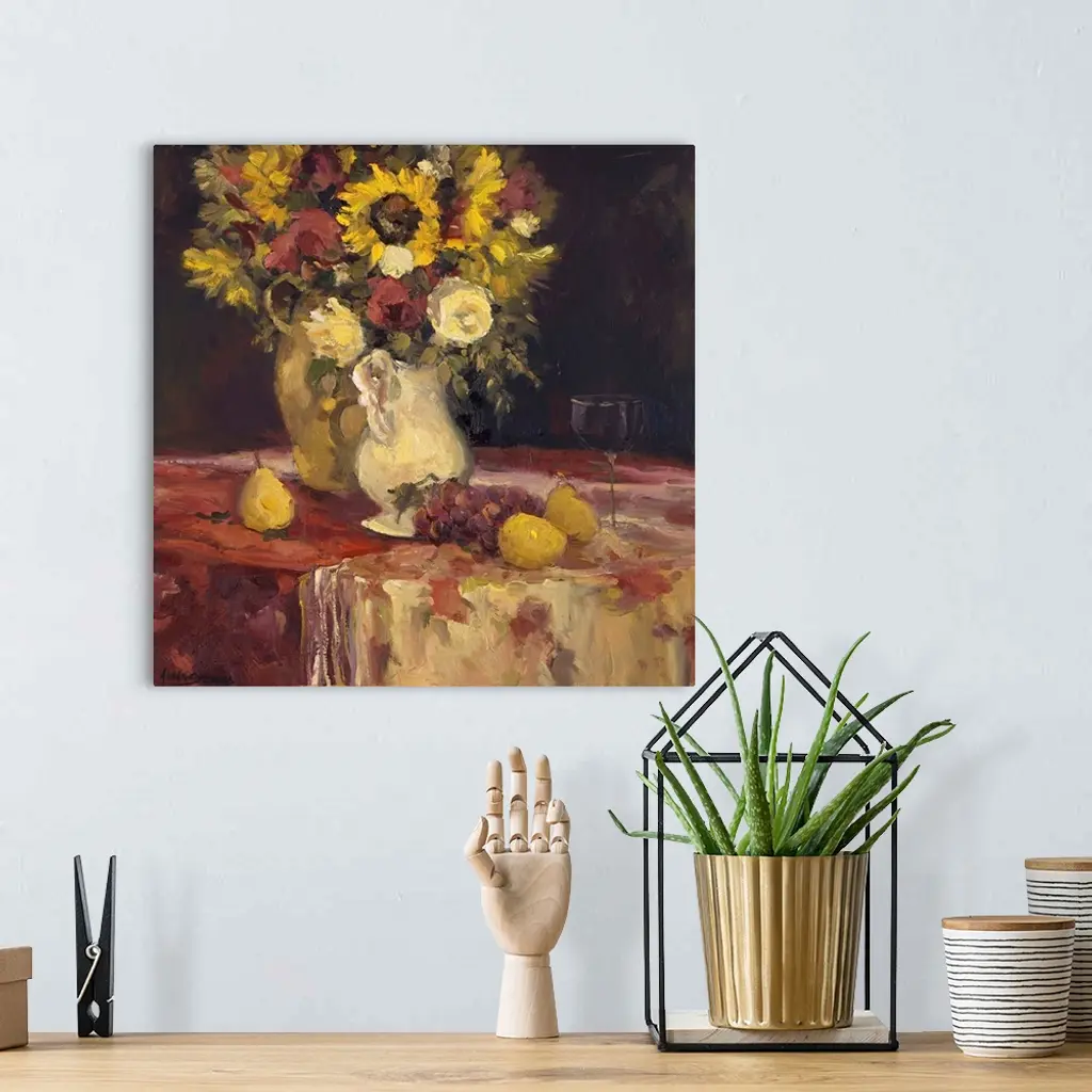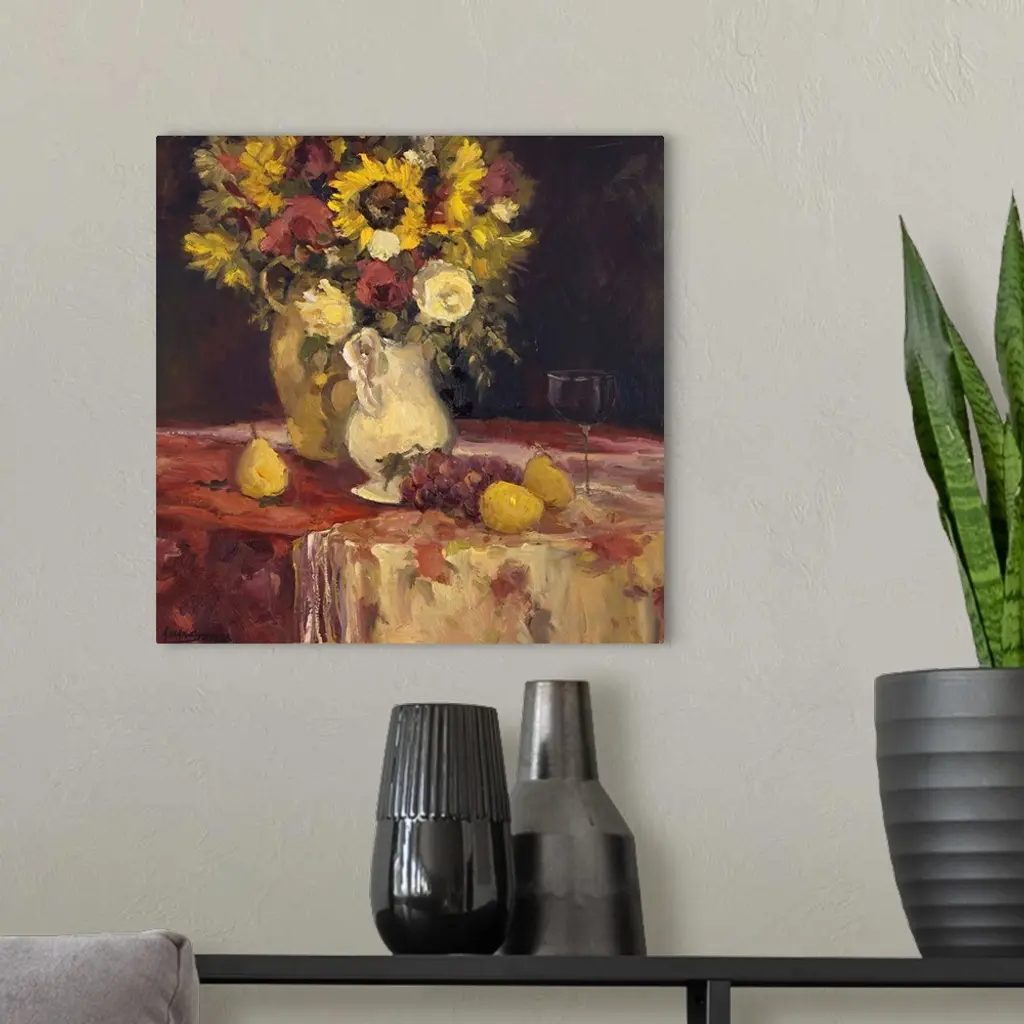 Fine art oil painting still life of bright yellow sunflowers, pears, lemons and grapes with a glass of red wine by Allayn Stevens.