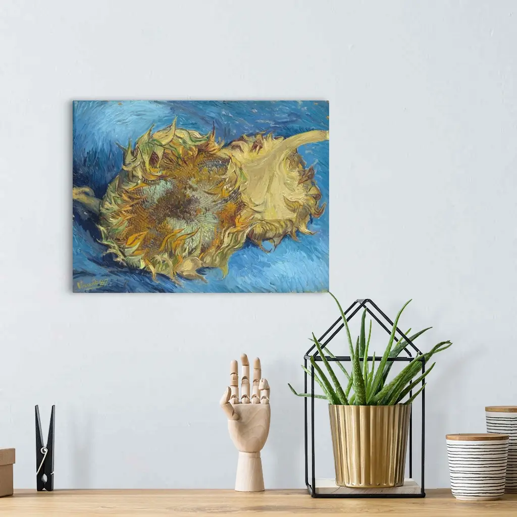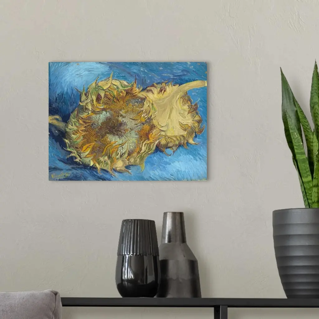 Van Gogh painted four still lifes of sunflowers in Paris in late summer 1887. There is an oil sketch for this picture (Van Gogh Museum, Amsterdam) as well as another painting of two sunflowers also signed and dated 1887 (Kunstmuseum Bern), and a larger canvas showing four sunflower heads (Kroller-Muller Museum, Otterlo). Paul Gauguin acquired the two smaller works, and until the mid-1890s, when he sold his most prized possessions to finance his South Seas voyage, they held pride of place above the bed in his Paris apartment.