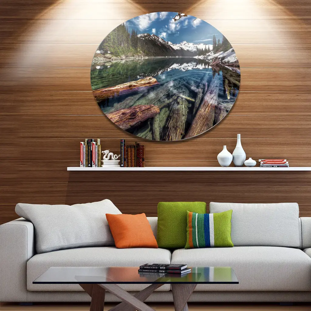 Bring Contemporary Abstraction to your home with this large Circle Metal wall art. This Sunken Logs n Mountain Lake Metal Artwork makes it the focal point of any room or office. - White Gloss Coating ensures colors are extra vibrant with light reflection.- Aluminum grade Sheet Metal with 1 inch mounting frame on the back giving the illusion that the artwork is floating on the wall..- Mounting Brackets are included along with instructions.- High Quality Digital images are created directly into a glossy aluminum panel producing a stunning and captivating print into the glossy finish of the metal.- Water, Fire and Scratch resistant HD Aluminum panels.- Looks better than any photo paper and guaranteed to last at least 20 years- Easy to clean with a microfiber cloth. Colors are far superior to regular Canvas Art. - Easy to Hang