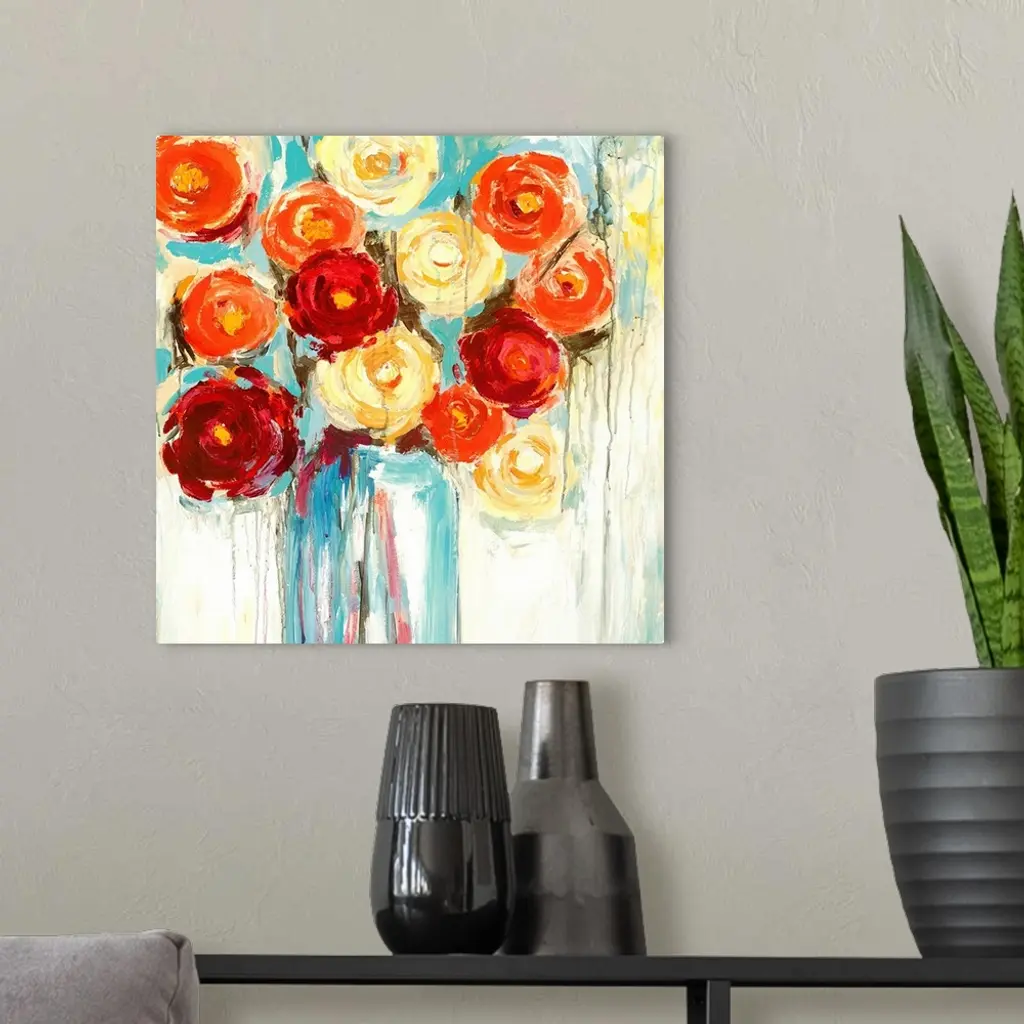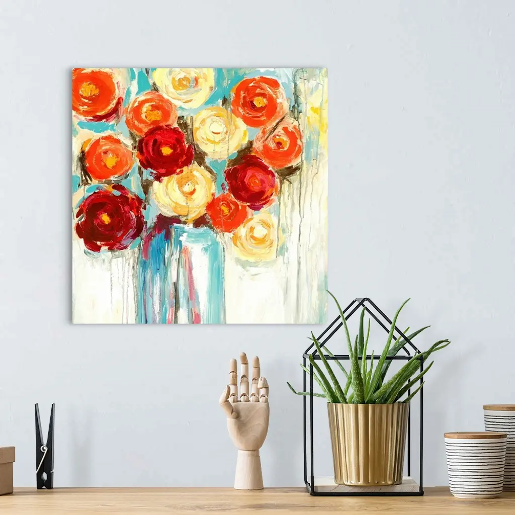 A complementary painting of a large vase of bright orange, red and yellow flowers in textured and dripped paint.