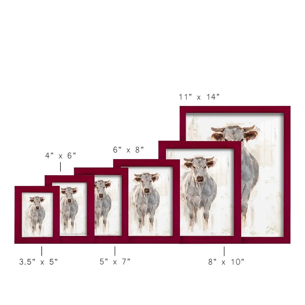 Sunlit Cows I -EZ SWITCH Framed Print w/glass-Cherry Red A delightful, framed print. Featuring a solid wood frame with real wood glass. This premium print is giclee quality. In addition, every frame features a removable back and table top stand. This allows you to change your art in the future or to just stand the art on a table for a new look. We are sure you'll enjoy our new series of EZ SWITCH Framed Art. Solid Wood Frame Real Glass Removable / Replaceable Art Built in Tabletop Stand Sizes range from 4x6 up to 12x15 - buy just one or pair them up as sets as you see fit.