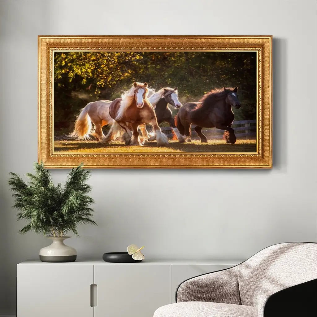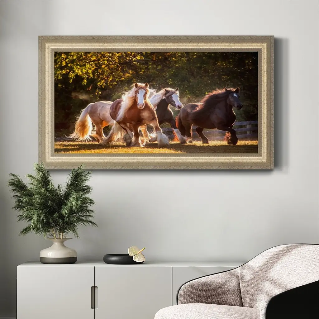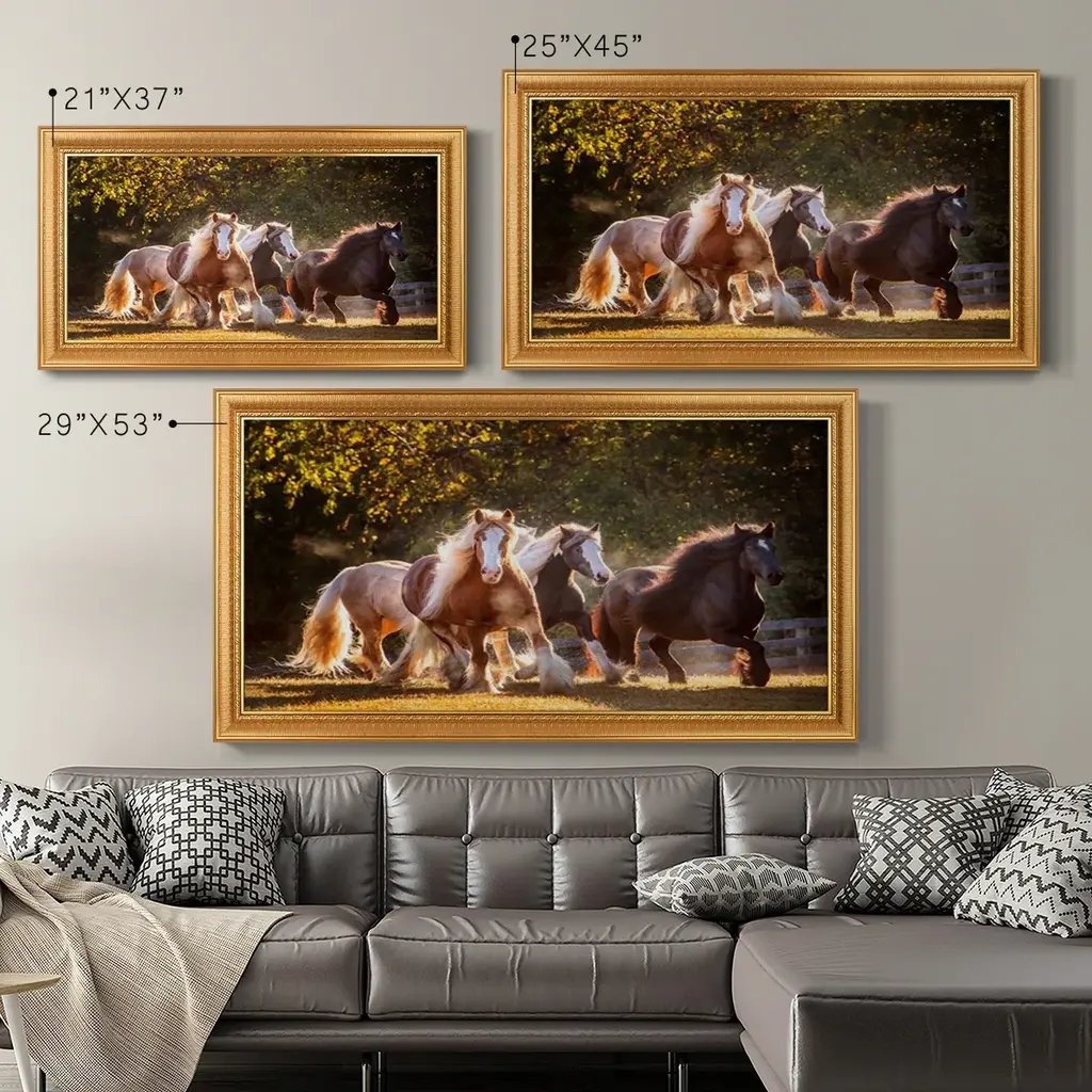 Sunlit Horses III Premium Framed Canvas- Ready to Hang A Premium Framed Canvas created to last. Framed in distressed wood and available in an array of sizes and colors Featuring a beveled a solid wood stretcher bar, each piece comes ready to hand 3 SIZES AVAILABLE 21''X37'' - Overall Size 25''X45'' - Overall Size 29''x53'' - Overall Size Each piece is made to order. Each piece comes with hanging hardware. Made in the USA Ready to Hang Giclee Paper Print Acrylic Glass Beveled Matt Board