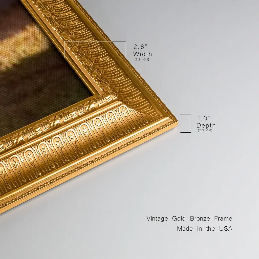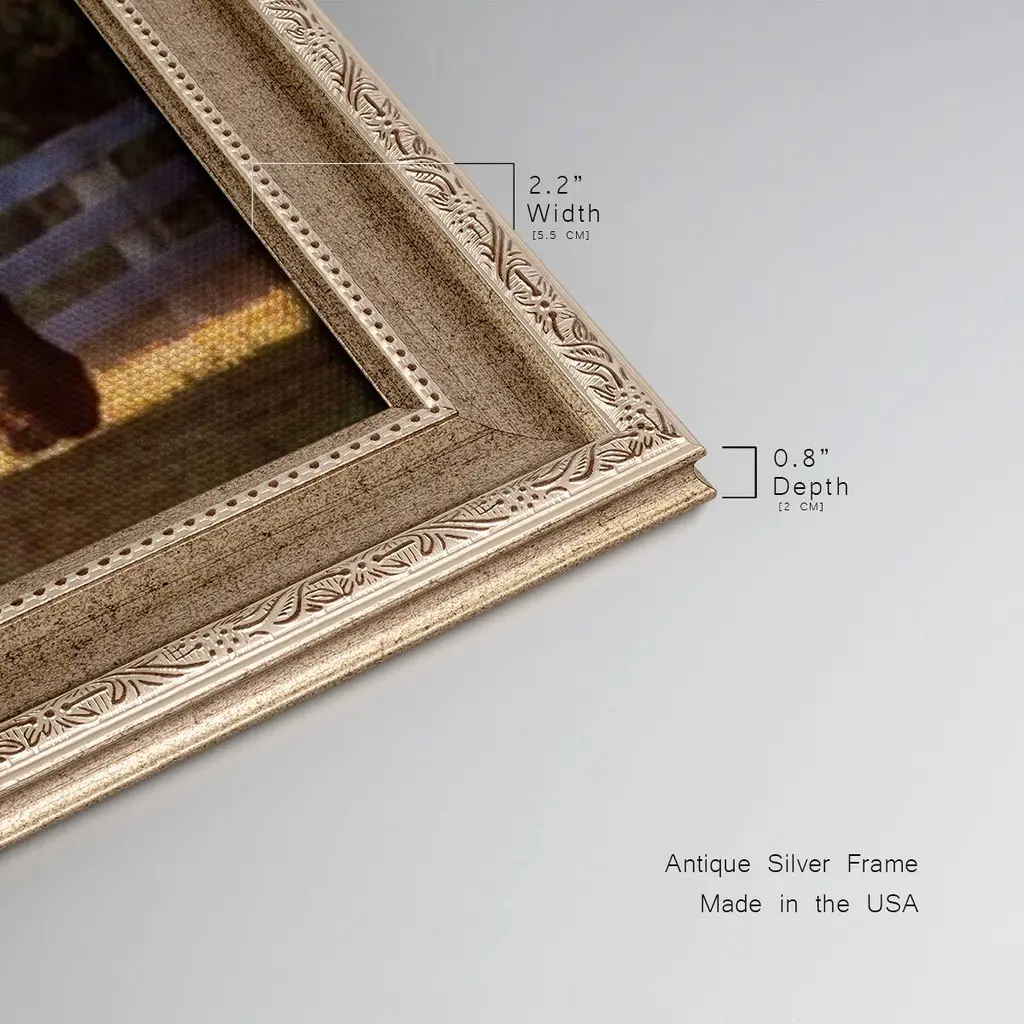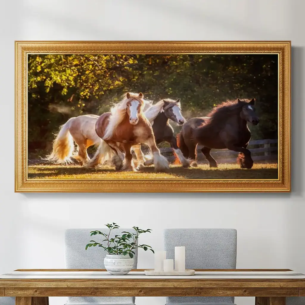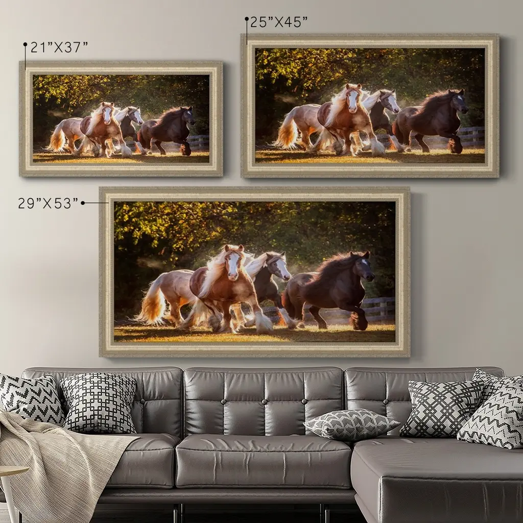 Sunlit Horses III Premium Framed Canvas- Ready to Hang A Premium Framed Canvas created to last. Framed in distressed wood and available in an array of sizes and colors Featuring a beveled a solid wood stretcher bar, each piece comes ready to hand 3 SIZES AVAILABLE 21''X37'' - Overall Size 25''X45'' - Overall Size 29''x53'' - Overall Size Each piece is made to order. Each piece comes with hanging hardware. Made in the USA Ready to Hang Giclee Paper Print Acrylic Glass Beveled Matt Board
