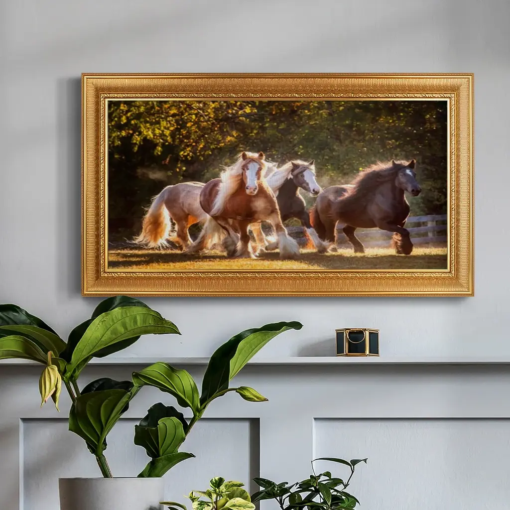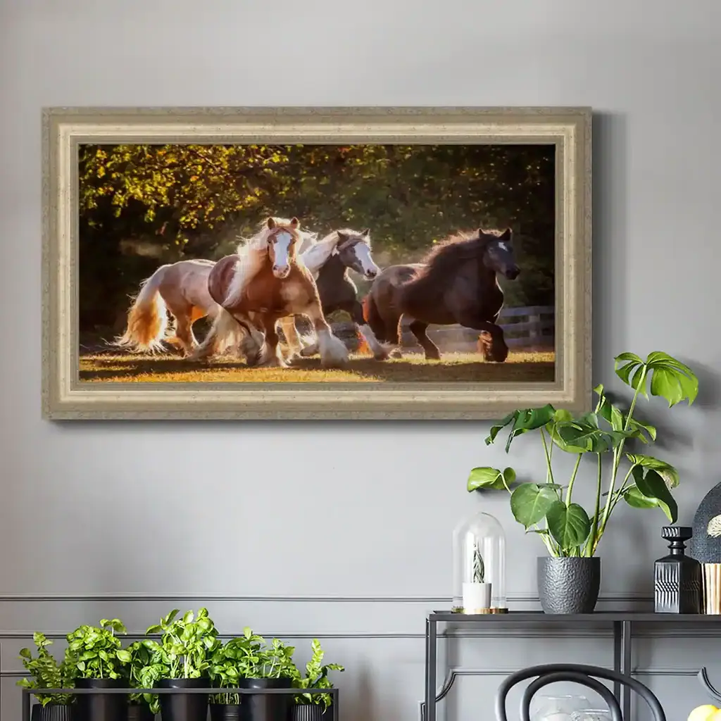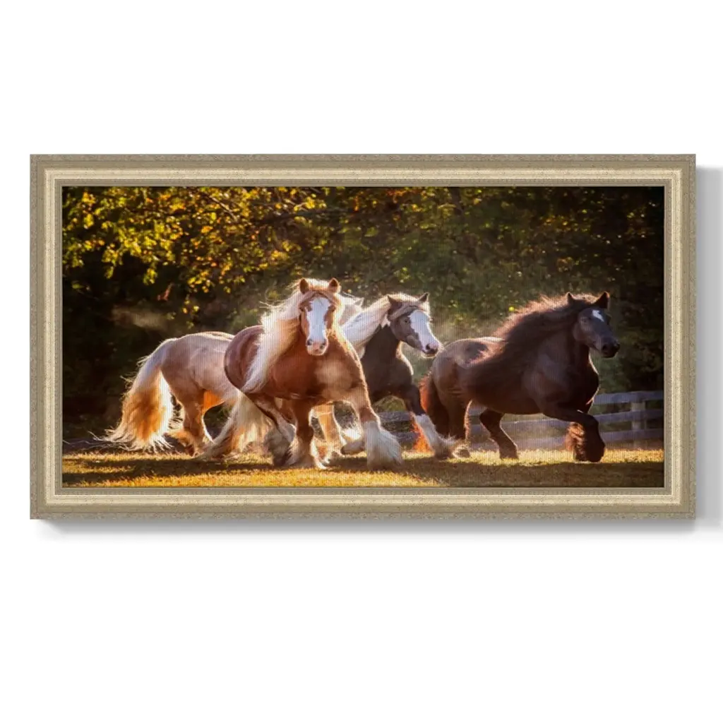 Sunlit Horses III Premium Framed Canvas- Ready to Hang A Premium Framed Canvas created to last. Framed in distressed wood and available in an array of sizes and colors Featuring a beveled a solid wood stretcher bar, each piece comes ready to hand 3 SIZES AVAILABLE 21''X37'' - Overall Size 25''X45'' - Overall Size 29''x53'' - Overall Size Each piece is made to order. Each piece comes with hanging hardware. Made in the USA Ready to Hang Giclee Paper Print Acrylic Glass Beveled Matt Board