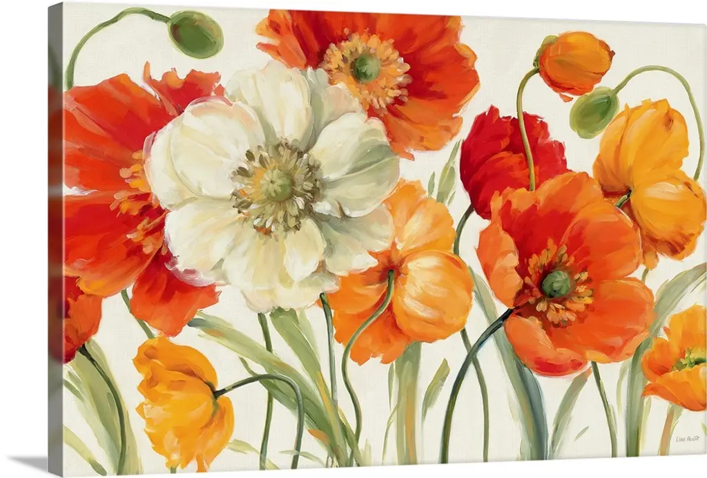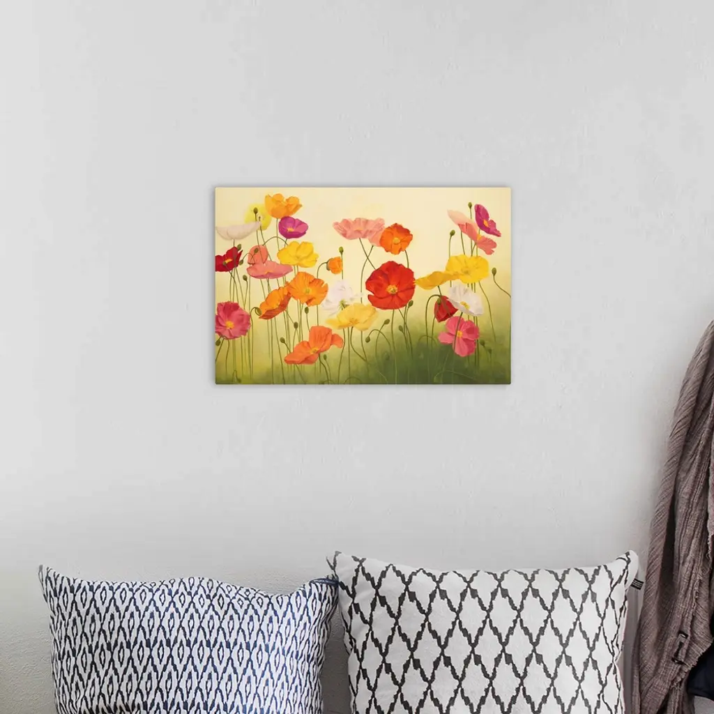 A contemporary painting of a group multi-colored poppy flowers in green grass.