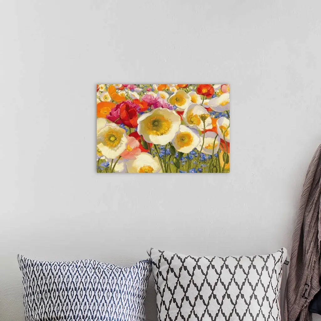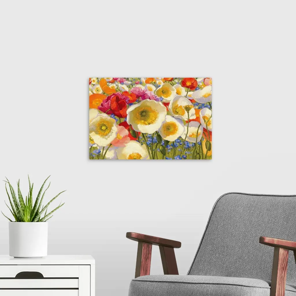 Close up nature painting of different floral plants and poppies. Horizontal wall art for the living room or kitchen.