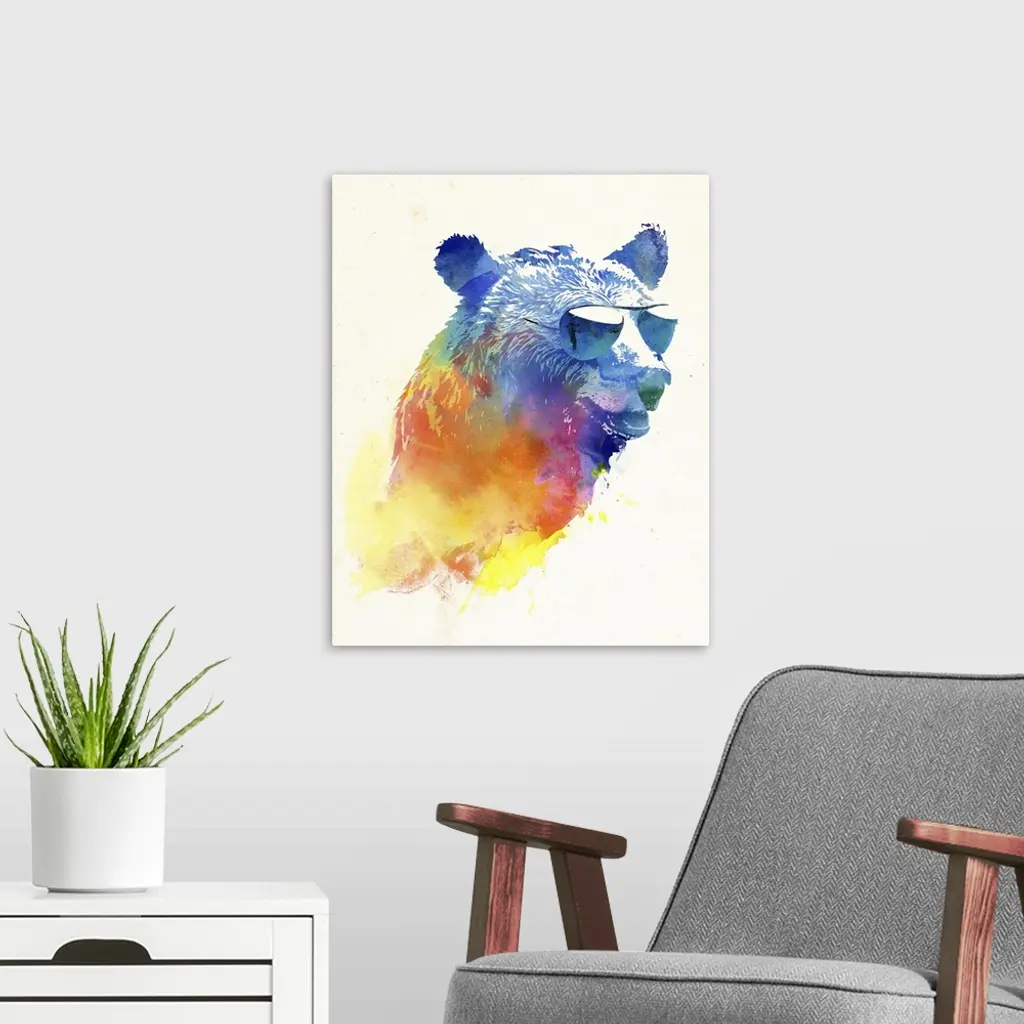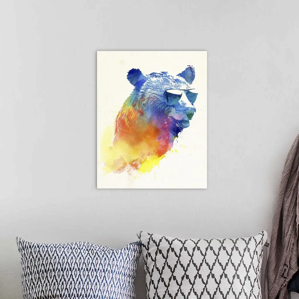 Contemporary artwork of a bear in multiple colors wearing sunglasses.