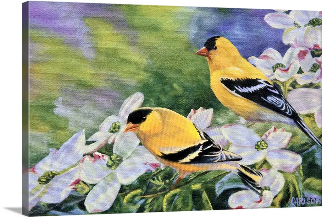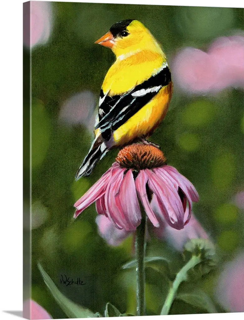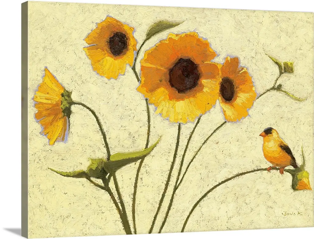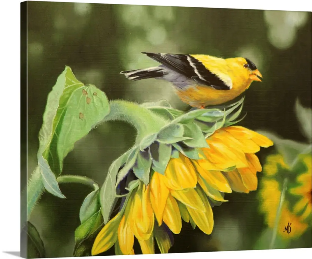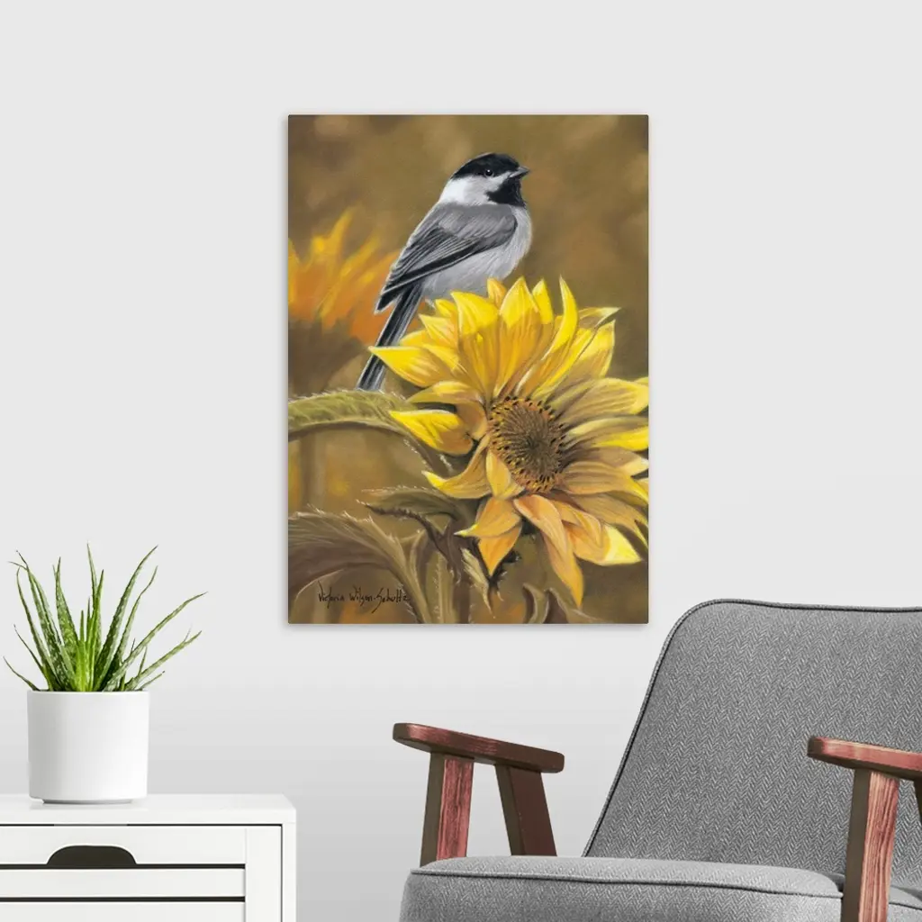 Beautiful artwork perfect for the home that shows a bird sitting on the top of a sunflower.