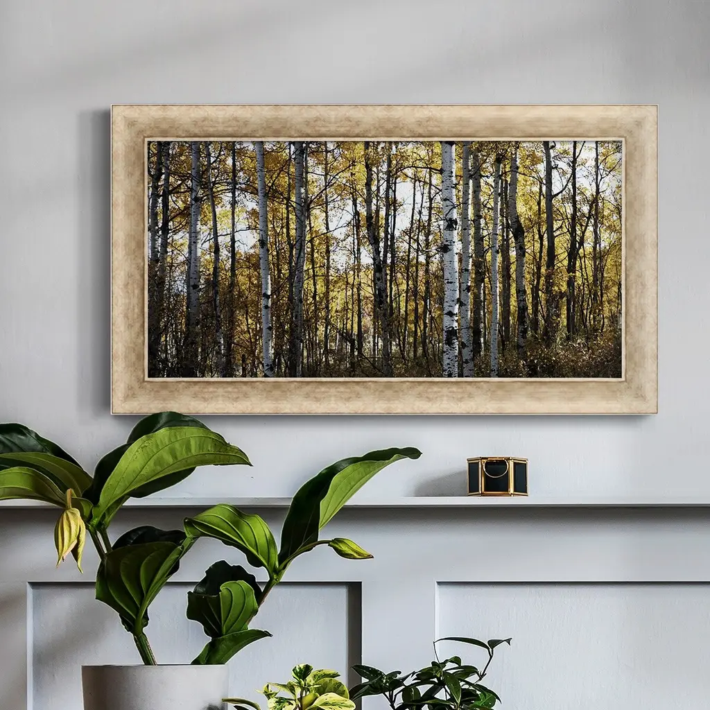 Sunny Grove Premium Framed Canvas- Ready to Hang A Premium Framed Canvas created to last. Framed in distressed wood and available in an array of sizes and colors Featuring a beveled a solid wood stretcher bar, each piece comes ready to hand 3 SIZES AVAILABLE 21''X37'' - Overall Size 25''X45'' - Overall Size 29''x53'' - Overall Size Each piece is made to order. Each piece comes with hanging hardware. Made in the USA Ready to Hang Giclee Paper Print Acrylic Glass Beveled Matt Board