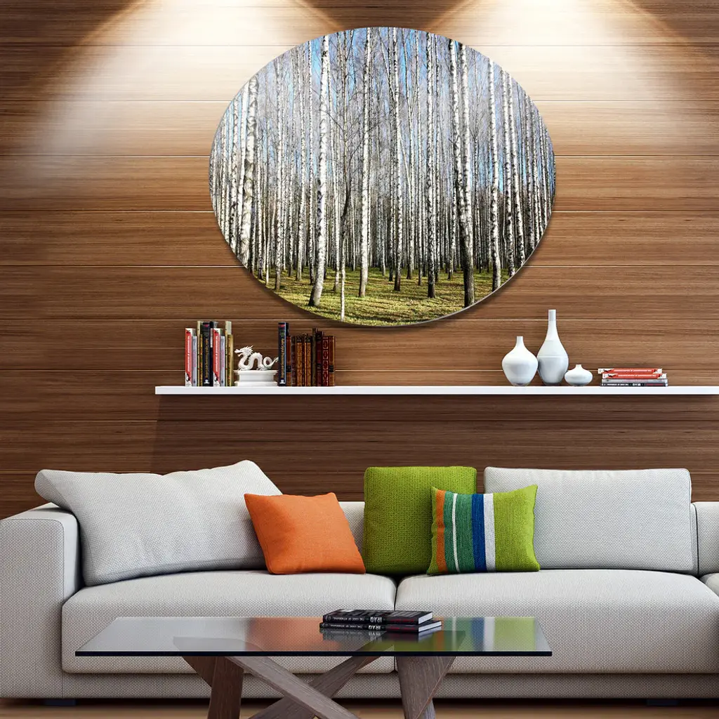Bring Contemporary Abstraction to your home with this large Circle Metal wall art. This Sunny November Day in Birch Grow Metal Artwork makes it the focal point of any room or office. - White Gloss Coating ensures colors are extra vibrant with light reflection.- Aluminum grade Sheet Metal with 1 inch mounting frame on the back giving the illusion that the artwork is floating on the wall..- Mounting Brackets are included along with instructions.- High Quality Digital images are created directly into a glossy aluminum panel producing a stunning and captivating print into the glossy finish of the metal.- Water, Fire and Scratch resistant HD Aluminum panels.- Looks better than any photo paper and guaranteed to last at least 20 years- Easy to clean with a microfiber cloth. Colors are far superior to regular Canvas Art. - Easy to Hang