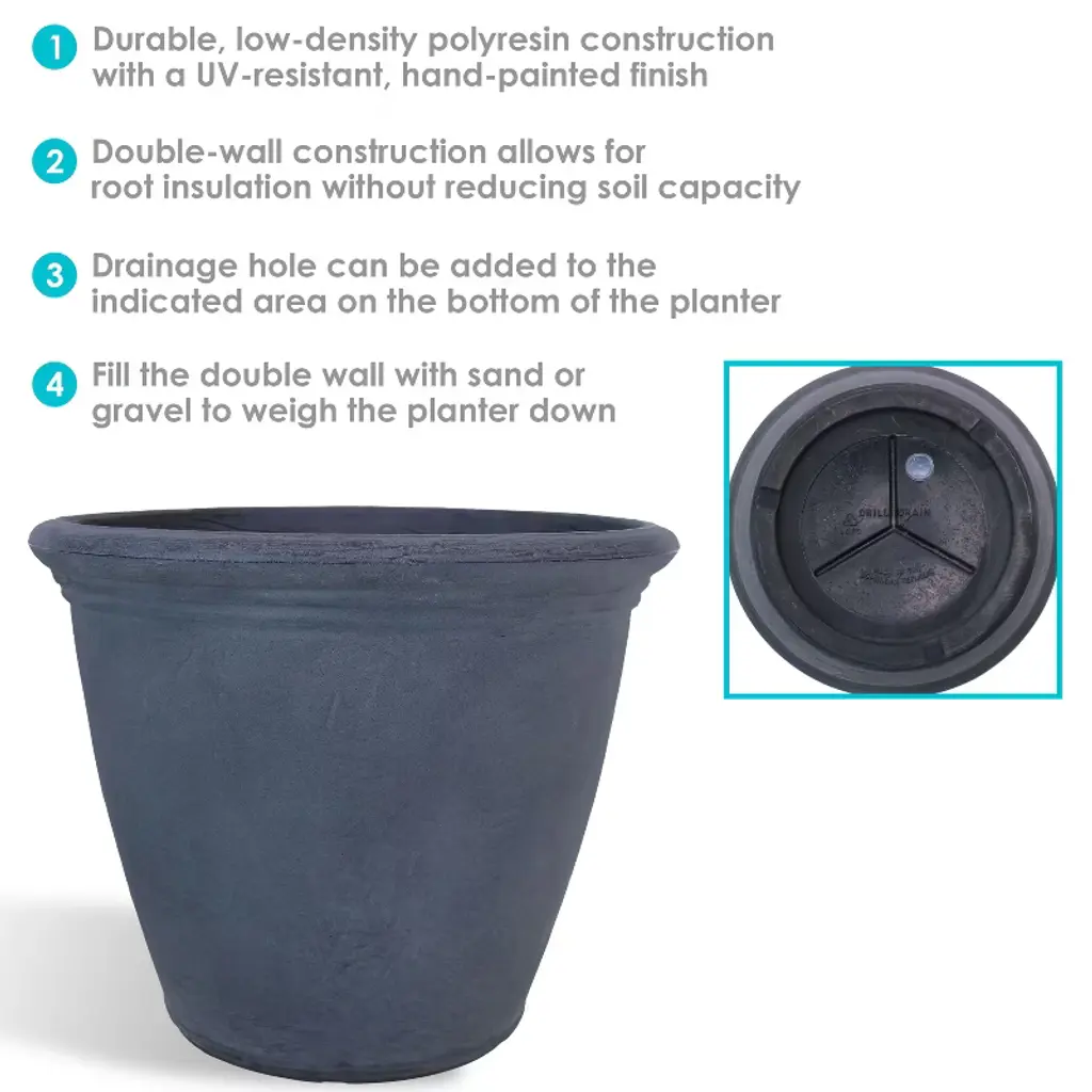 Create a beautiful accent for favorite plants in the home or garden with this large flower pot. Featuring a hand-painted finish, this planter has the charming look of a weathered container, adding rustic character wherever placed. The linear low-density polyethylene construction gives this planter the strength and durability to handle the elements. Not only can it withstand harmful UV rays, but it can also resist cracking in cold temperatures. This planter can even be placed outside in windy locations. The double-wall construction features a space that can be filled with sand or gravel to weigh down the planter so that it stays put on gusty, blustery days. Plus, the full-depth inner wall provides insulation to protect roots from changes in temperature, so plants can grow healthier. Not only can this versatile planter be used outdoors, but it also makes a beautiful decorative piece indoors too when paired with a protective saucer.• LARGE SIZE: Garden pots have a 20 inches diameter x 16 inches tall; 12-inch bottom diameter; Weighs 5.2 pounds per planter; Ideal for both inside and outside use• CRACK RESISTANT: Patio planters are made of durable linear low density polyethylene (polyresin); Resists cracking damaging UV rays; Does not crack in cold temperatures; Beautiful hand-painted finish gives piece textured look; Conveniently lightweight to easily move to your ideal spot. Due to the manual painting process, slight variations in color may occur.• VERSATILE BOTANICAL BASE: Includes 2 planter baskets; Rugged appearance with simple design of plant container complements many different styles of decor, including rustic, farmhouse, traditional and more; Perfect for your favorite houseplants or bringing your outdoor plants indoors for the winter; Drainage hole(s) can be added to area(s) indicated at bottom of planter using 1/4-inch drill bit (planters are double walled and drill must penetrate both walls)• DOUBLE WALLED DESIGN: Full depth inner wall protects and insulates roots from changes in temperature; Flower container does not sacrifice on soil capacity; If you live in a windy location you can easily fill the space between the inner and outer wall of the planter with gravel or sand to weigh it down (plug at the bottom of planter is not for drainage; this is where you will fill planter with gravel or sand)• WORRY-FREE PURCHASING: Sunnydaze Decor backs its products with a 1-year manufacturer's warranty.