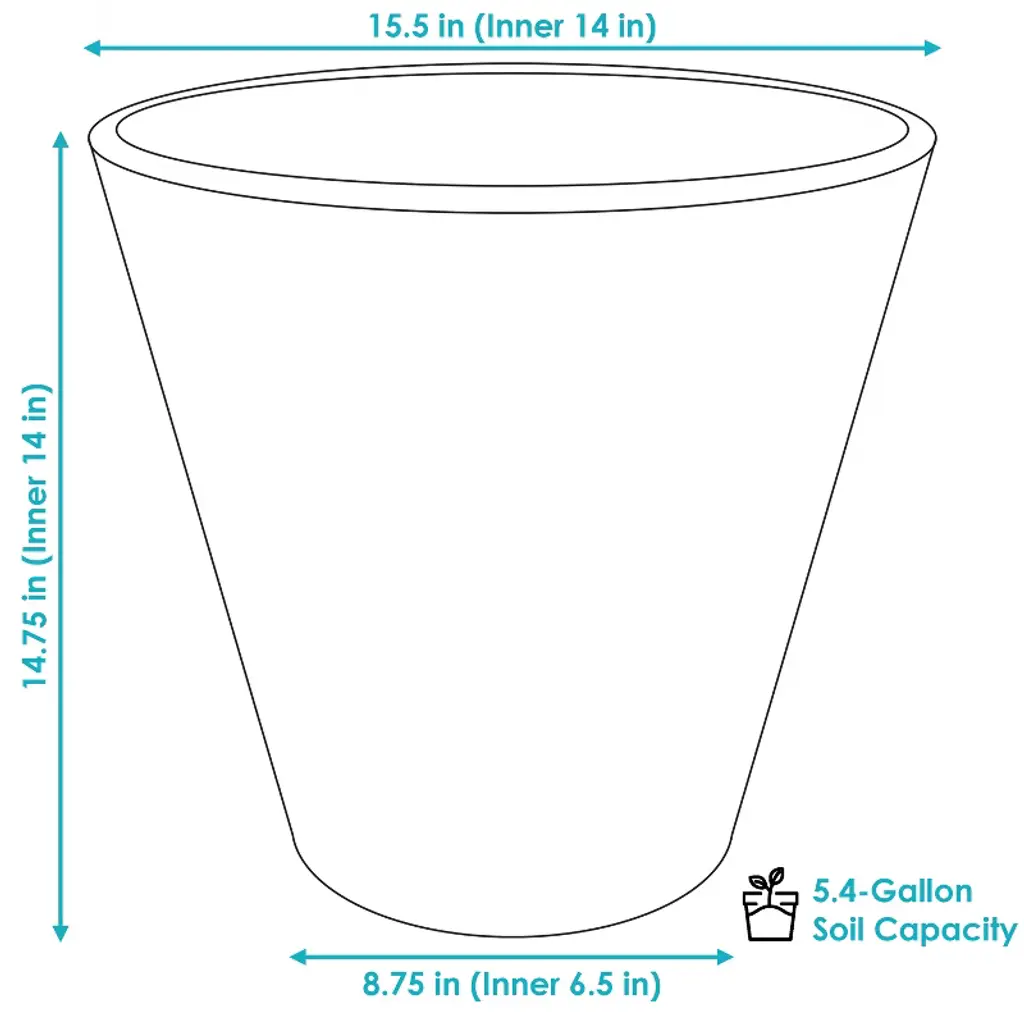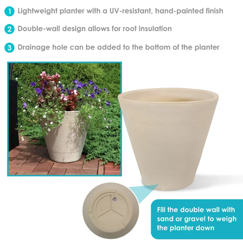 This modern, ribbed Walter large garden pot will add instant yet subtle elegance to any ferns, roses, or other plants and flowers when placed on the patio, deck, front porch, entryway, garden, or within walkways throughout the yard. The decorative planter features rows of ribs and is designed for all weather conditions due to its linear, low-density, polyethylene (polyresin) construction and UV-resistant, hand-painted finish. This pot remains lightweight so it can easily be moved anywhere. The double-wall design with full-depth inner wall allows for optimal root insulation without compromising the soil capacity. Also, if living in a windy environment, place gravel or sand in the space between the 2 walls to help stabilize it in stronger winds. The planter can be used indoors as well. Please make sure to use a protective saucer when placing indoors to ensure surfaces or floors do not get damaged.• AMPLE GROWING SPACE: This outdoor flowerpot has a 15.5" outer top diameter, 14" inner top diameter, 8.75" outer bottom diameter, 7" inner bottom diameter, 14.75" outer height, and 14" inner height. The planter weighs 2.8 lbs. It can hold 5.4 gallons/0.73 cubic feet/21.8 quarts. The large size makes this planter great for growing plants and flowers both inside and outside.• LIGHTWEIGHT AND DURABLE: This patio planter pot is made from durable, linear low-density polyethylene (polyresin). Polyresin resists cracking from damaging UV rays and cold temperatures. The planter features a hand-painted finish that gives it a rich hue and weathered appearance. The flowerpot is lightweight and easy to carry to any indoor or outdoor space. Due to the manual painting process, some slight variations in color may occur.• EQUIPPED FOR DRAINAGE: The rugged appearance and simple design of this large outdoor planter complements many different styles of decor. It's great for growing houseplants or bringing outdoor plants indoors for the winter. A drainage hole can be added to the area indicated on the bottom of the planter using a 1/4" drill bit. The planter is double-walled and must be drilled to penetrate both walls for proper drainage.• ENHANCED INSULATION: The full depth of the inner wall protects and insulates roots from changes in temperature without sacrificing soil capacity. The round plant pot's outer wall can be filled with gravel or sand to weigh it down to withstand windy conditions. Remove the plug at the bottom of the planter to fill the outer wall.• WORRY-FREE PURCHASING: Sunnydaze Decor backs its products with a 1-year manufacturer's warranty.